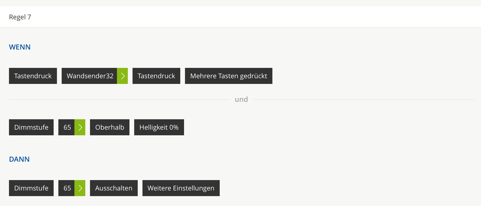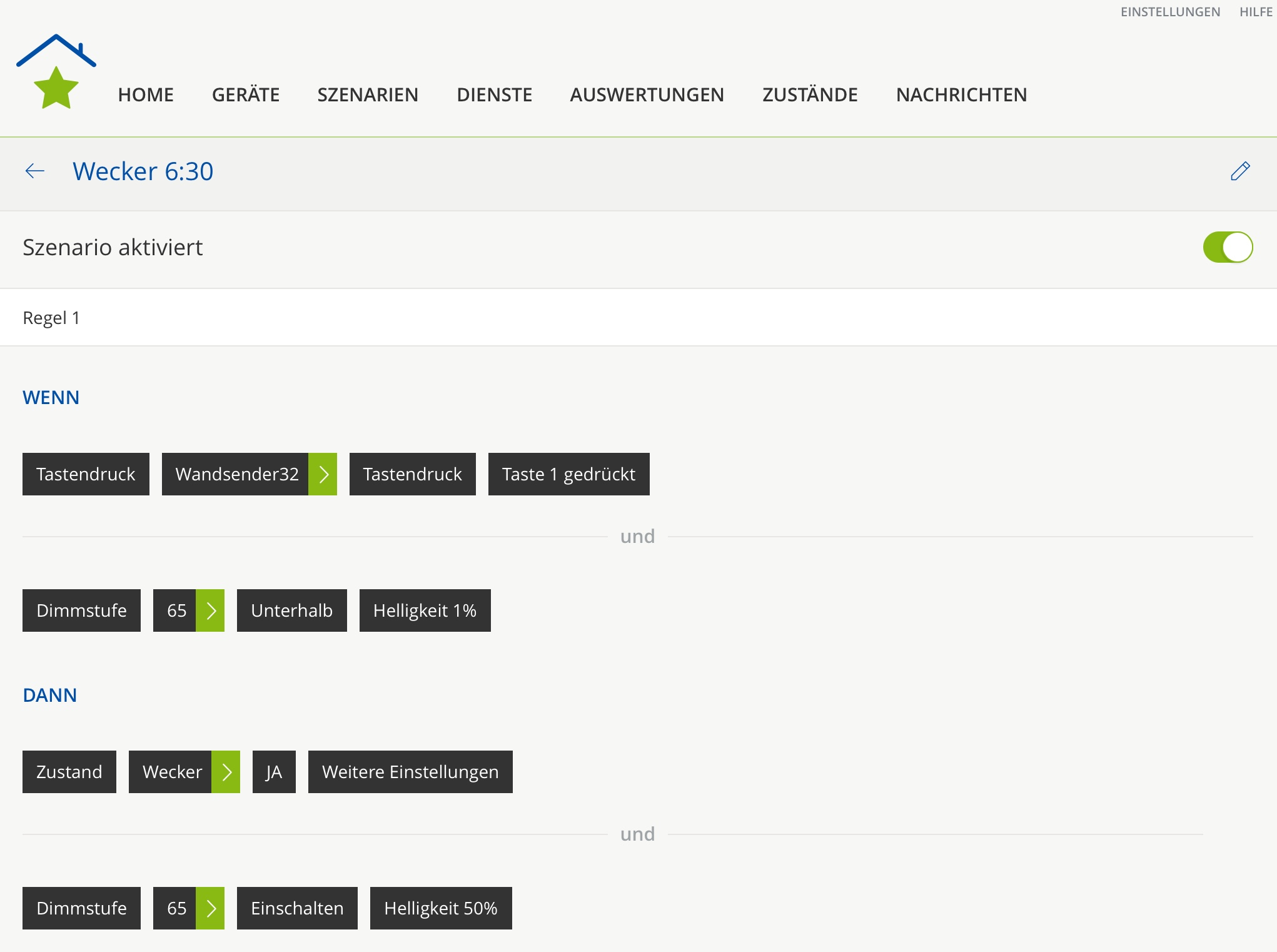 Regel 1 setzt bei Tastendruck (oben) den Zustand „Wecker“ auf JA und schaltet die Nachttischlampe EIN auf 50%