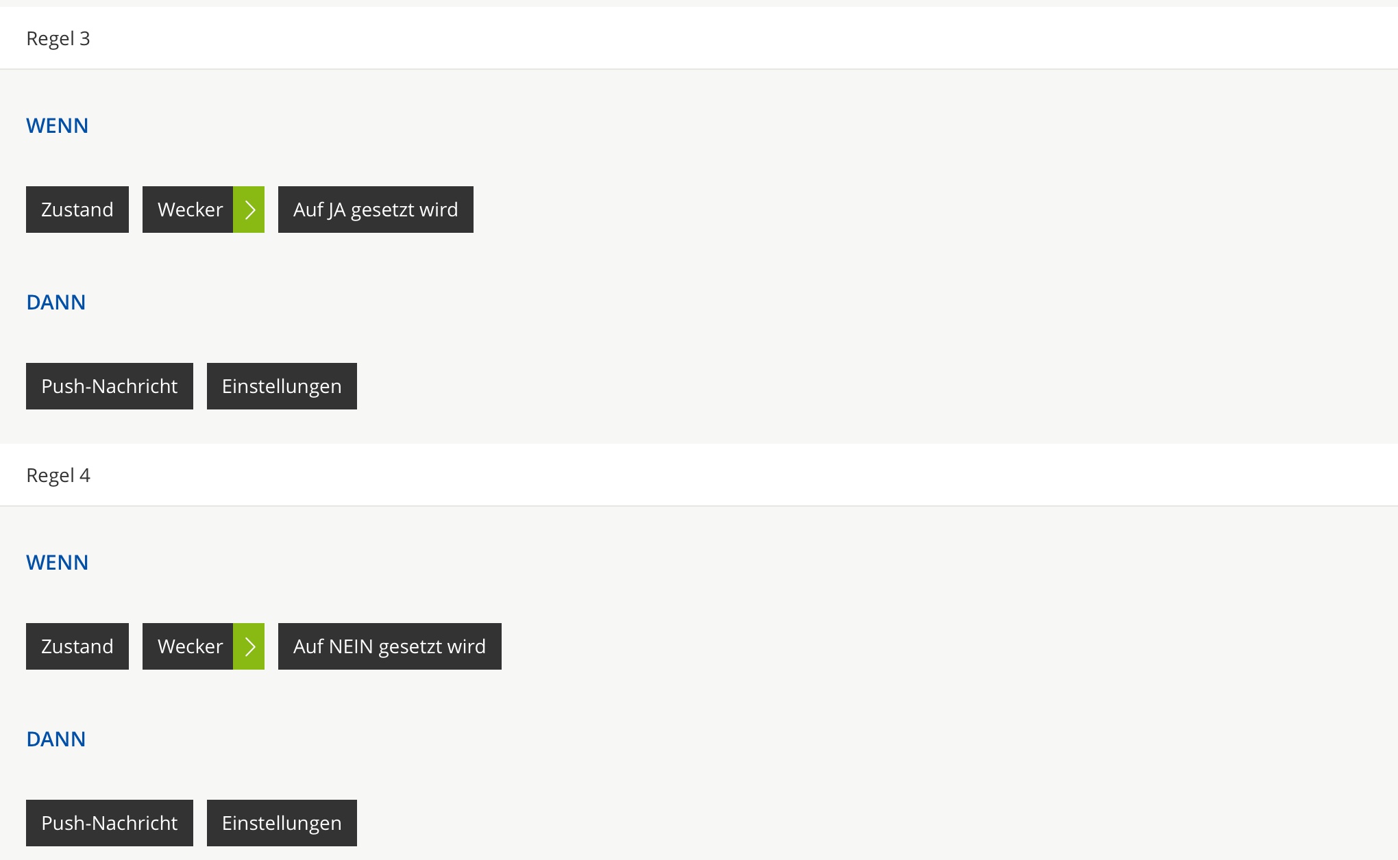 Regel 3+4 bestätigen per Pushnachricht ob der Zustand "Wecker" ein- oder ausgeschaltet ist. Der Text ist frei wählbar zB "Morgen wecken" bzw"Ich kann ausschlafen".