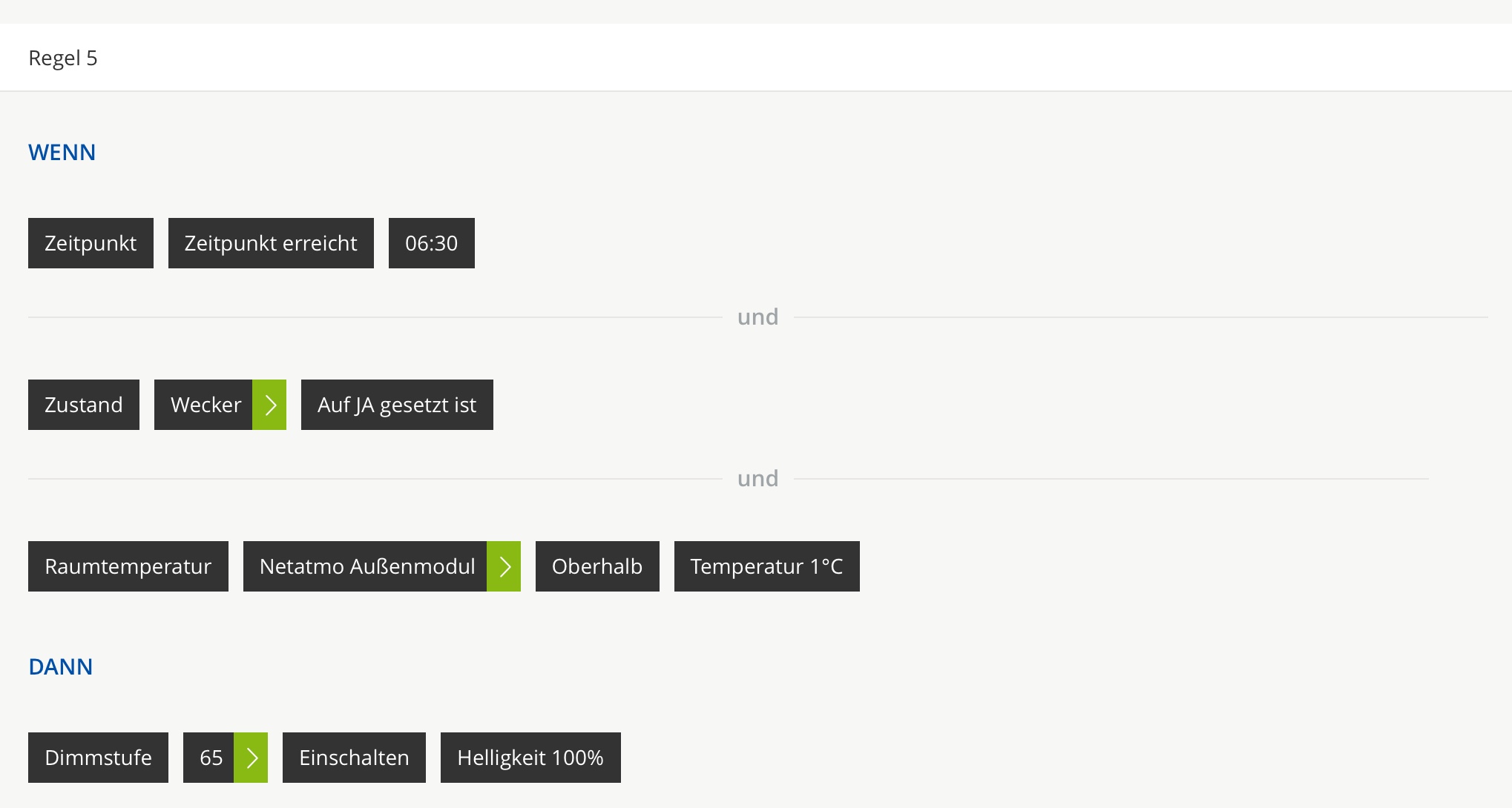 Regel 5 löst den Wecker um 06:30 Uhr (Auslöser) aus, wenn folgende Bedingungen zutreffen