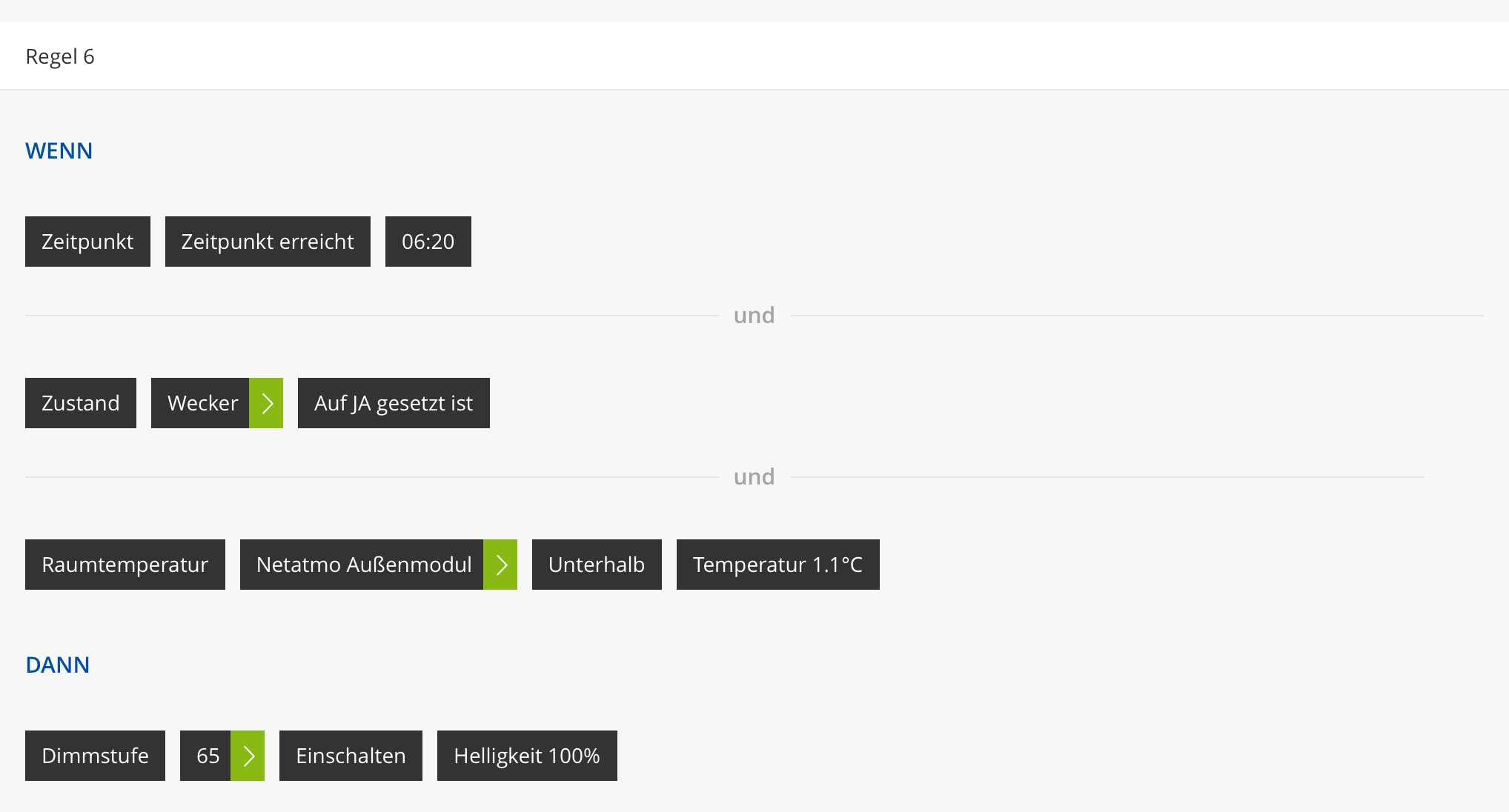 Regel 6 löst den Wecker um 06:20 Uhr (Auslöser) aus, wenn folgende Bedingungen zutreffen