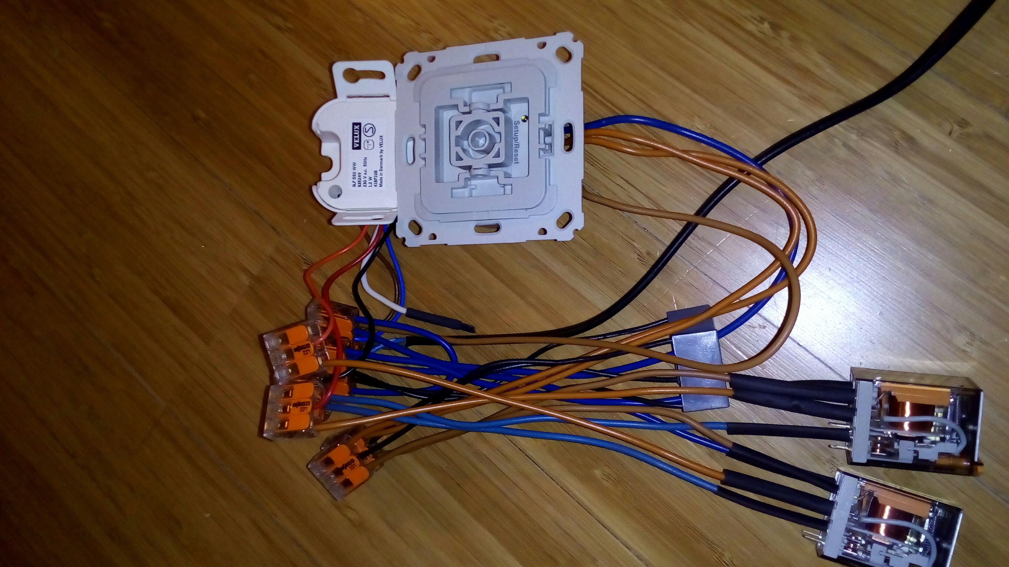 Man nehme Innogy Rolladenschalter und von Velux den UP Sender. Des weiteren zwei Relais und zwei Löschkondensatoren. Beim verdrahten auf die Phasenlage achten. Anderenfalls werden die Relais nicht korrekt angesteuert.