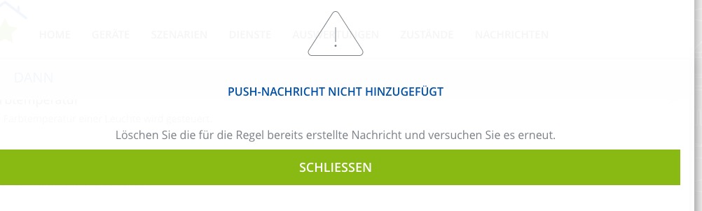 sehr interessant, mit Deinen Emails geht das astrein, ich hatte statt der EMails(für jeden Fenstersensor) in der Rule statt EMAIL eine Pushnachricht verwendet. Obwohl eine Push in einem Szenario problemlos funktioniert, macht das System beim zufügen der 2. Push (in der nächste Rule) nicht mit, dann kommt der Fehler unten. Danke für die Info