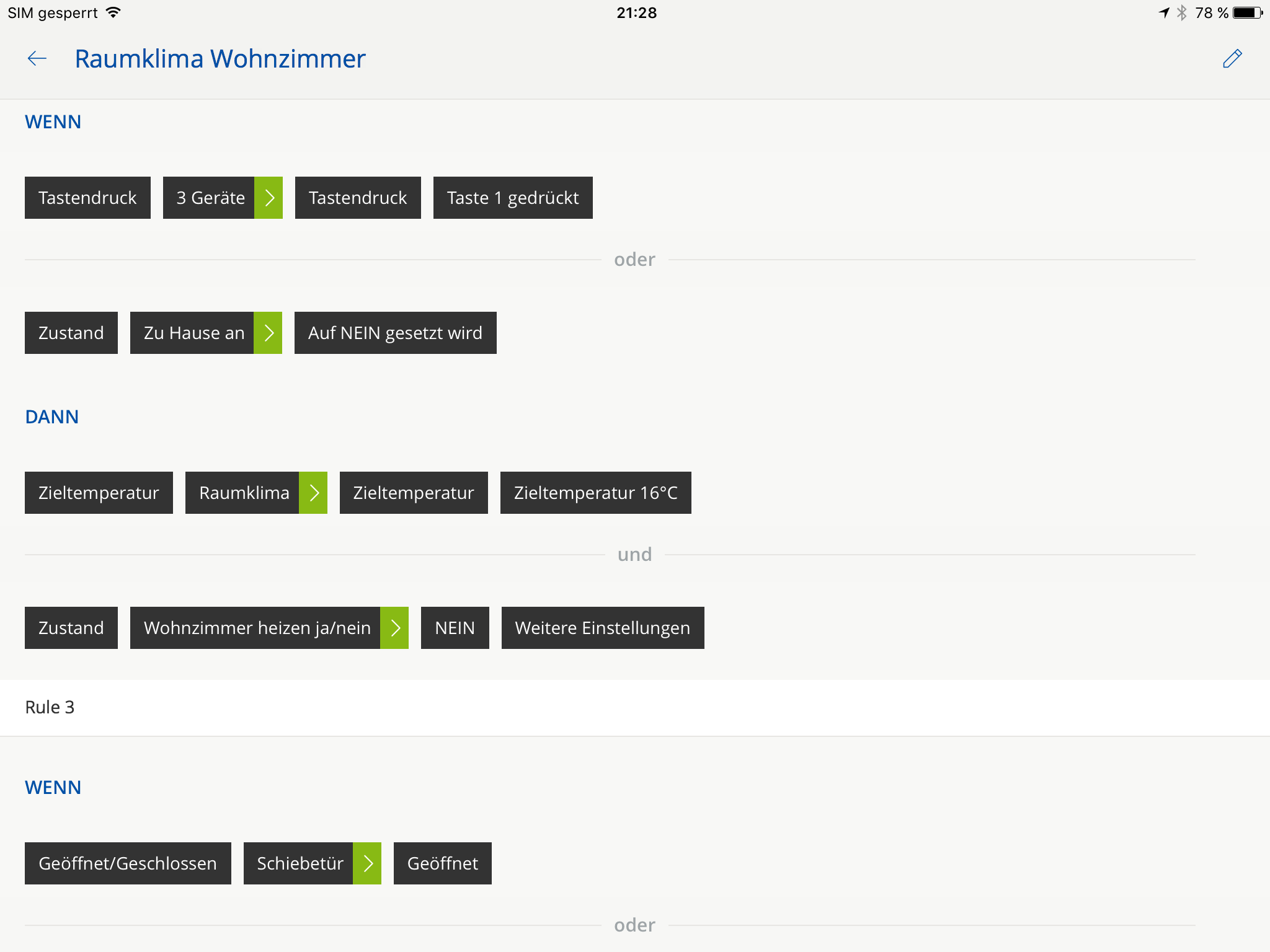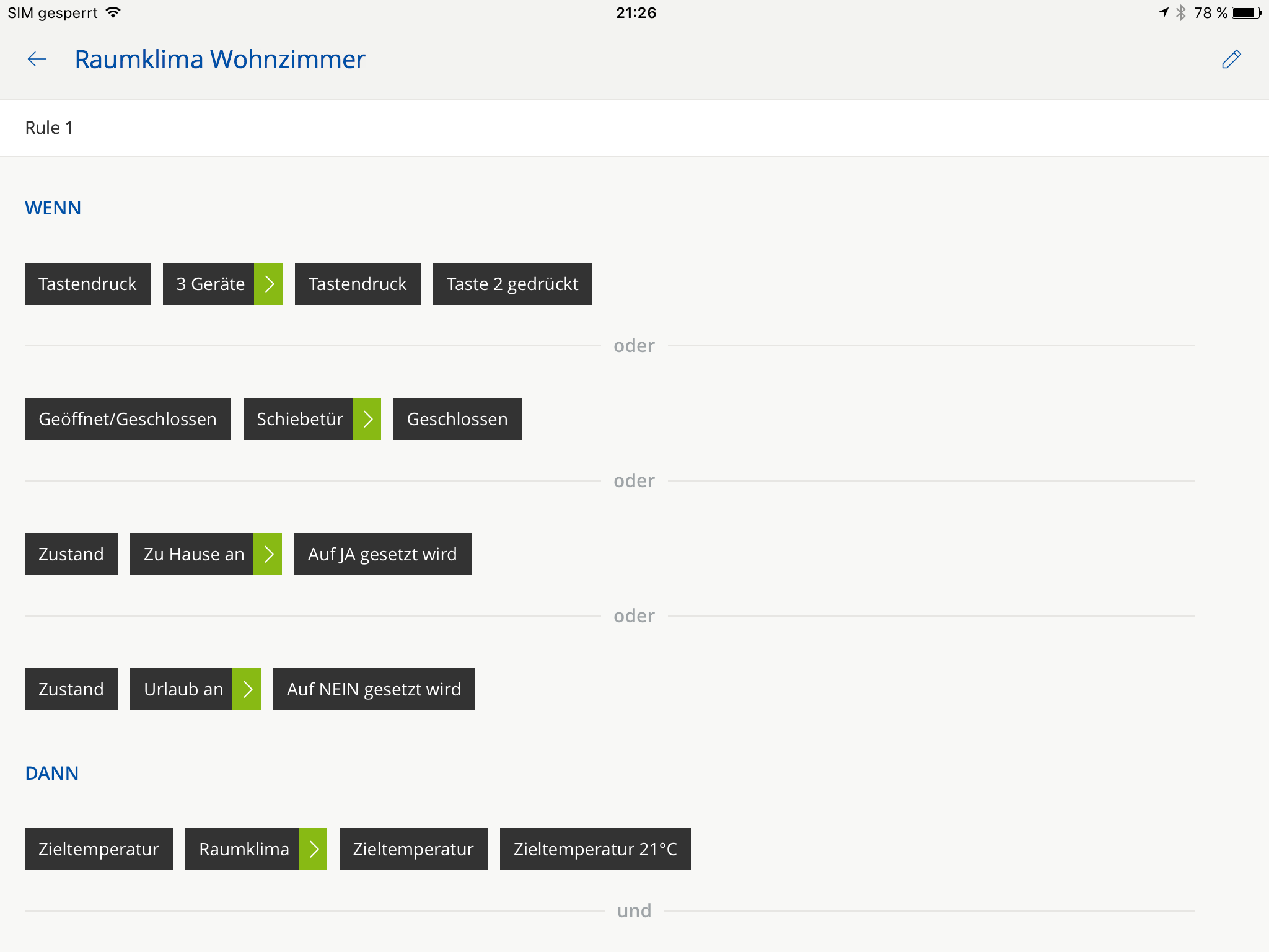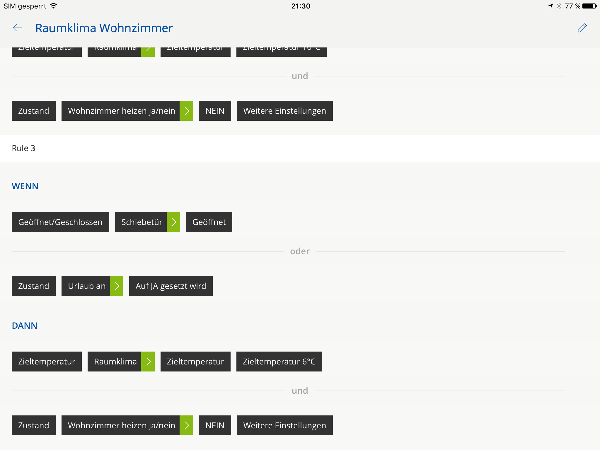Rule1 WENN ZEITPUNKT 07:00 und ZUSTAND URLAUB/FEIERTAG/FREIERTAG AUF JA GESETZT IST dann ZIELTEMPERATUR usw