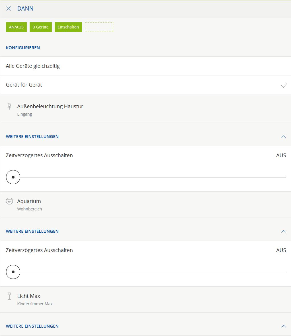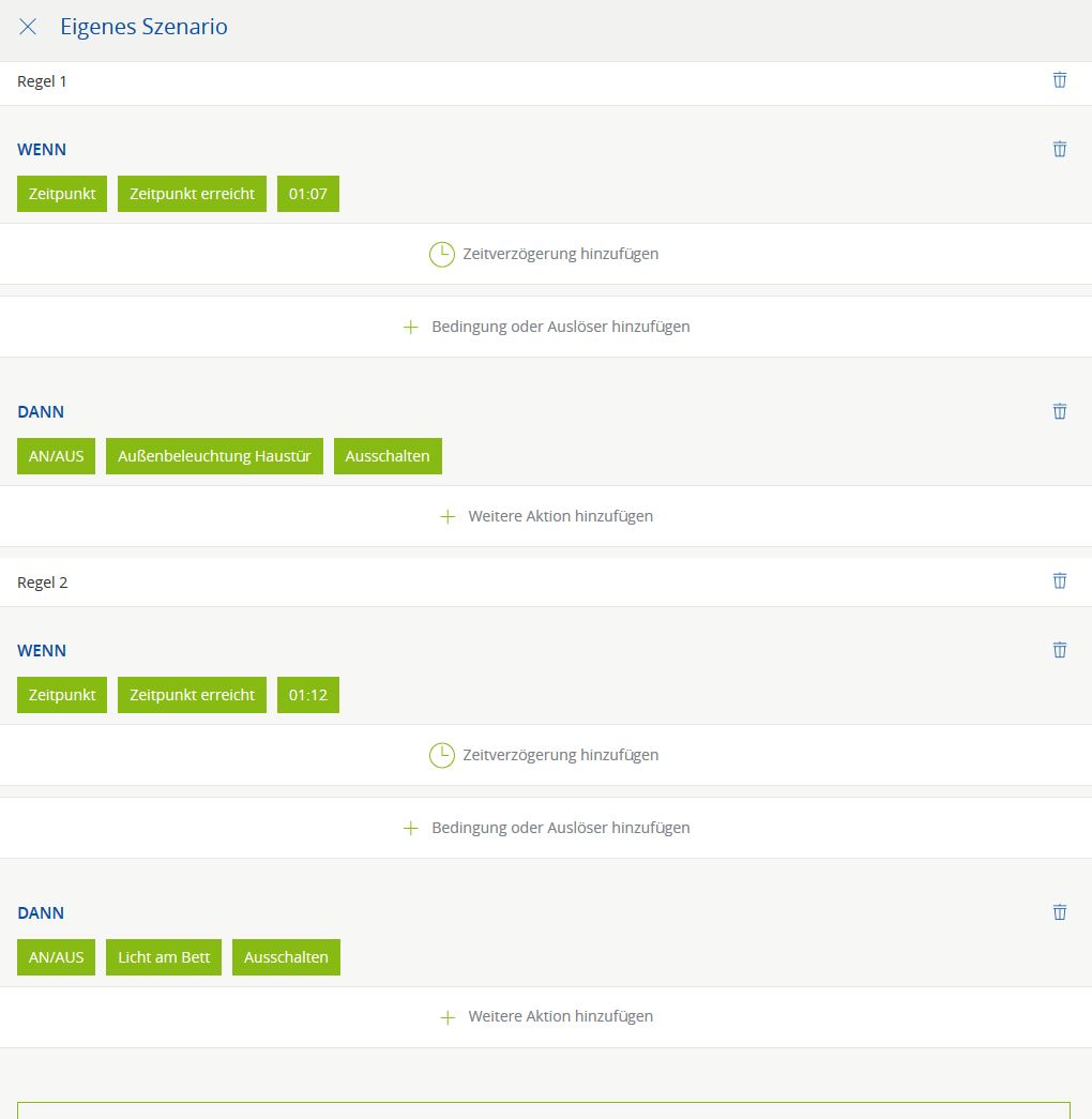 Gerne würde ich um 01.07h, dass Lichter innerhalb von 5 Minuten unterschiedlich ausgehen. Dazu finde ich aber im System nichts. Es wird mir keine Einstellung angeboten wie "Gerat für Gerät" ausschalten.