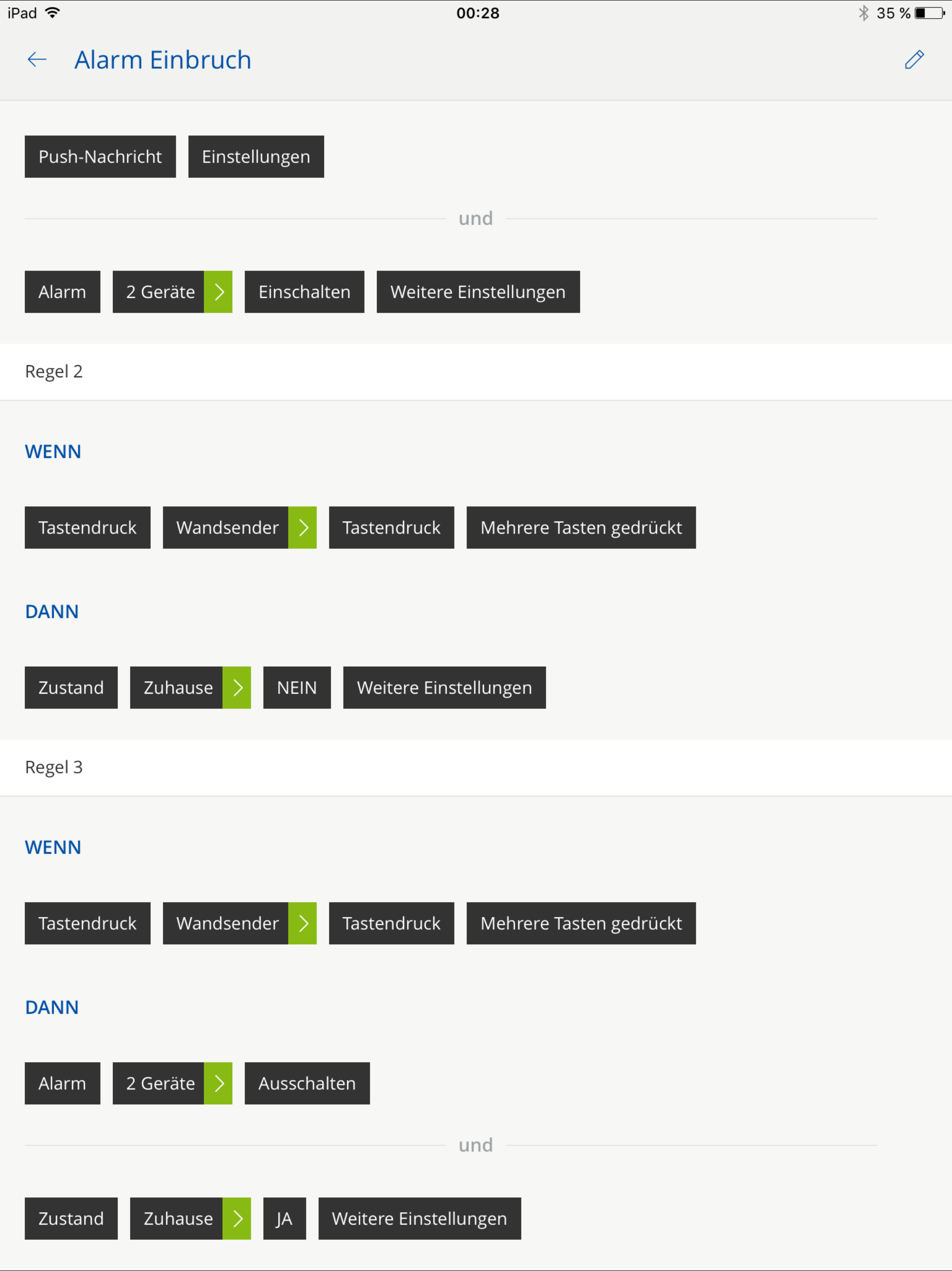 Das Szenario habe ich übernommen von Innogy... das passt ja soweit ... nur das der Alarm nur sporadisch auslöst ! Ich gehe eigentlich davon aus das wenn Ich den Schalter drücke zum aktivieren der Alarmanlage das es jedesmal funktioniert wenn z.B. die Tür geöffnet wird.... dies ist aber nicht so.....!!!