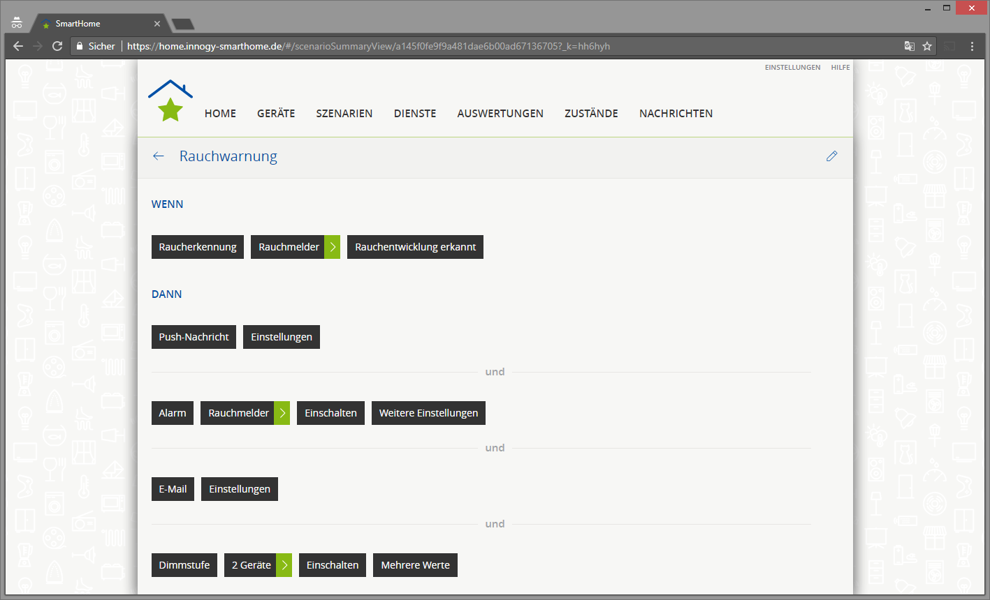 • Bzgl. der Verzetzung zw. alten und neuen Melder kann ich nichts sagen, ich gehe aber davon aus, das sie vernetzt werden sollten. Die E-Mail-Versendung im Meldefall kannst du direkt im Szenario unter "Dann" hinterlegen. Für E-Mail gibt es eine eigene Kategorie in der Auswahl.
