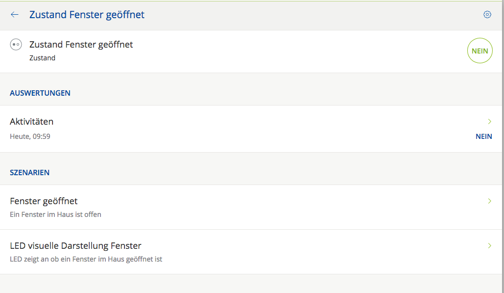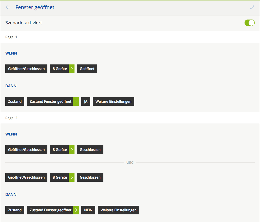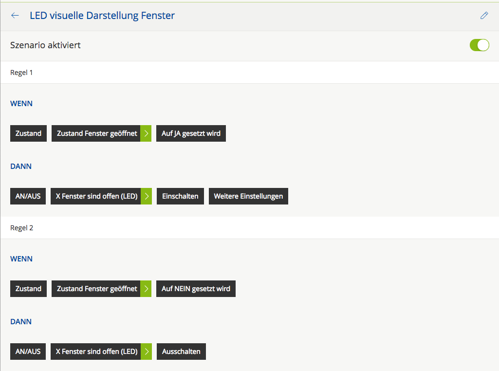 Gelöst wurde das über einen neuen Zustand namens: "Zustand Fenster geöffnet" und 2 Szenarien, "Fenster geöffnet" und "LED visuelle Darstellung Fenster"