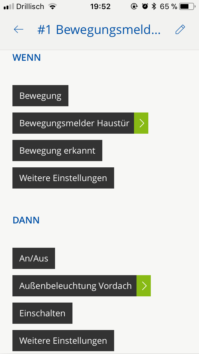Also nutze ich nun Parallel das Bewegung-Szenario von Innogy, damit ist die Schaltzeit deutlich besser allerdings wird nach Ablauf der Zeit das Licht ausgeschaltet.