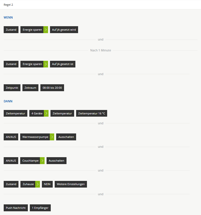 - Tagsüber (ab 8 Uhr) dient er auch als „Master-Schalter“ und regelt alle Heizungen noch weiter runter, schaltet Lampen aus und schaltet zudem die Warmwasserpumpe ab und setzt den Zustand Zuhause auf Nein!