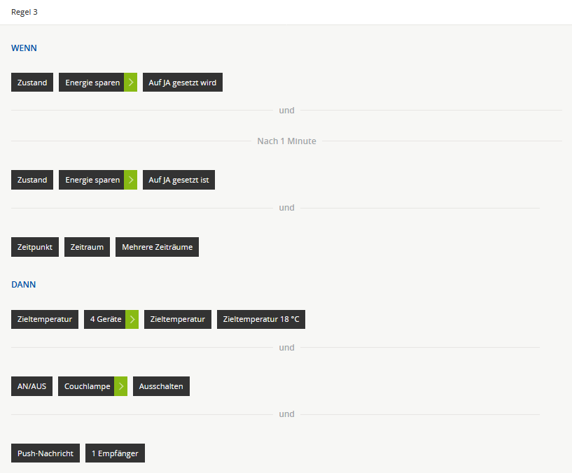 Die Verzögerung von 1 Minute habe ich eingestellt, falls man mal aus versehen drückt und dann noch Zeit hat die andere Taste zu drücken um Energie sparen wieder auszuschalten. Daher dann die folgende Abfrage ob der Zustand noch auf Ja steht (wird ja sonst automatisch nach 10 Minuten zurückgesetzt).