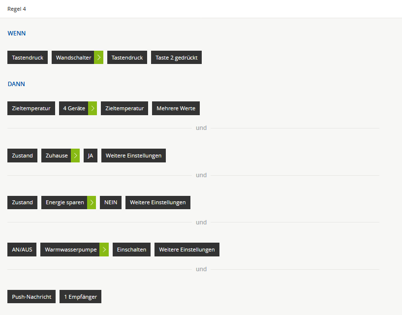 - Abends (ab 20 Uhr) dient er als „Master-Schalter“ vor dem zu Bett gehen der alle Heizungen runterregelt und (über innogy steuerbare) Lampen ausschaltet. Die Warmwasserpumpe sowie der Zustand Zuhause bleiben dabei an!