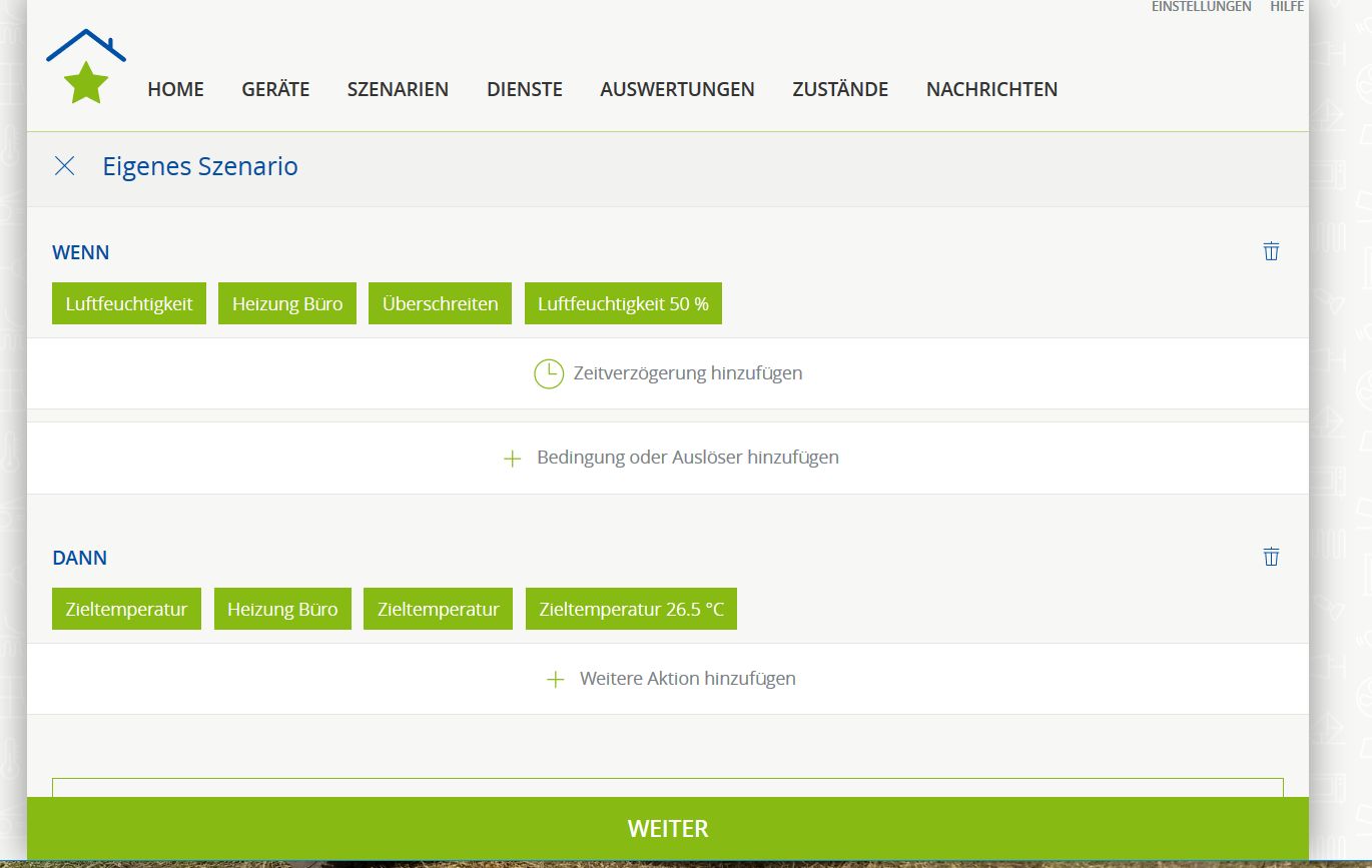 • Hallo! Ja, bei dem Erreichen einer definierten Luftfeuchtigkeit kann man die automatisch Heizung hochfahren. Siehe Bild (auf die Schnelle ein Beispielszenario erstellt, geht natürlich noch besser)