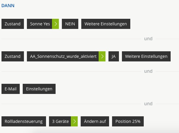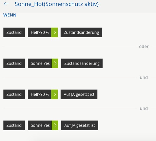 • leider ist das nicht ganz richtig..... wenn ich die Rolläden auf "Sonnenschutz" fahre und dann entscheide trotz Sonne die Rolläden hochzufahren dann brauche ich eine Übersteuerung der Helligkeit....sonst würden die sofort wieder runterfahren. An warmen Tagen nutze ich den Sonnenschutz an Tagen in denen es kühler ist UND die Sonne scheint möchte ich aber manuell wieder öffnen können- dafür brauche ich dann ein "Bit" - iim Prinzip wie bei Michael Sagner beschrieben... es gibt immer viele Wege