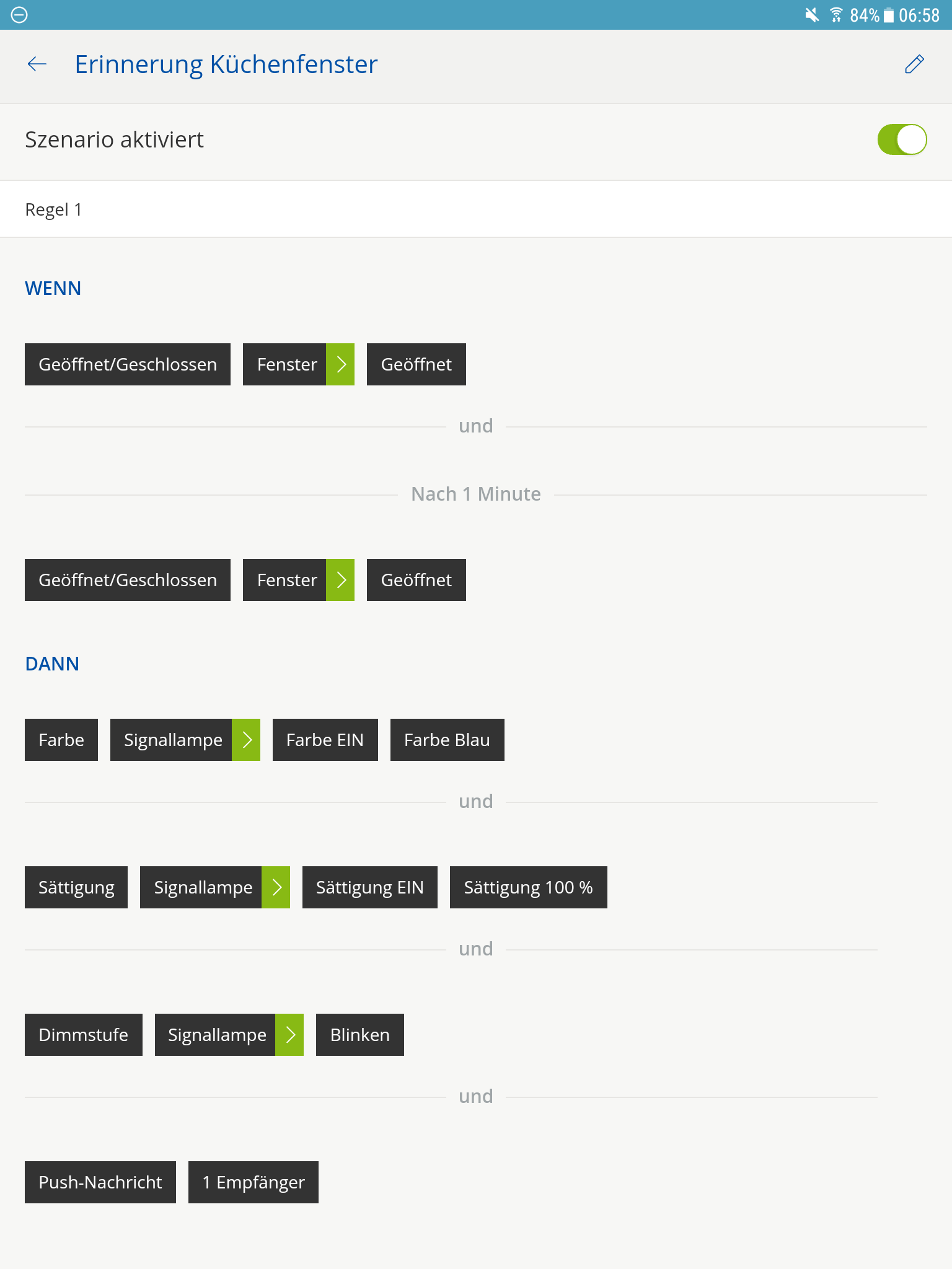 • Jetzt, hier ist der Knackpunkt. Das Fenster kann nicht gleichzeitig Auslöser und Bedingung sein. Ich würde hierfür noch über einen Zustand gehen. Dieser wird nach 15 min gesetzt. Dieser ist dann der Auslöser für dein obiges Profil. Du kannst den Zustand z.B. Fenster nennen, dann kannst Du diesen von allen TFK´s schalten lassen. Aufpassen, wenn Push verwendet wird. bei mir wird immer nur die aktuellste angezeigt. Mach dies lieber über Mail. Dies ist für den Fall gedacht wenn mehrere Fenster geöffnet sind.