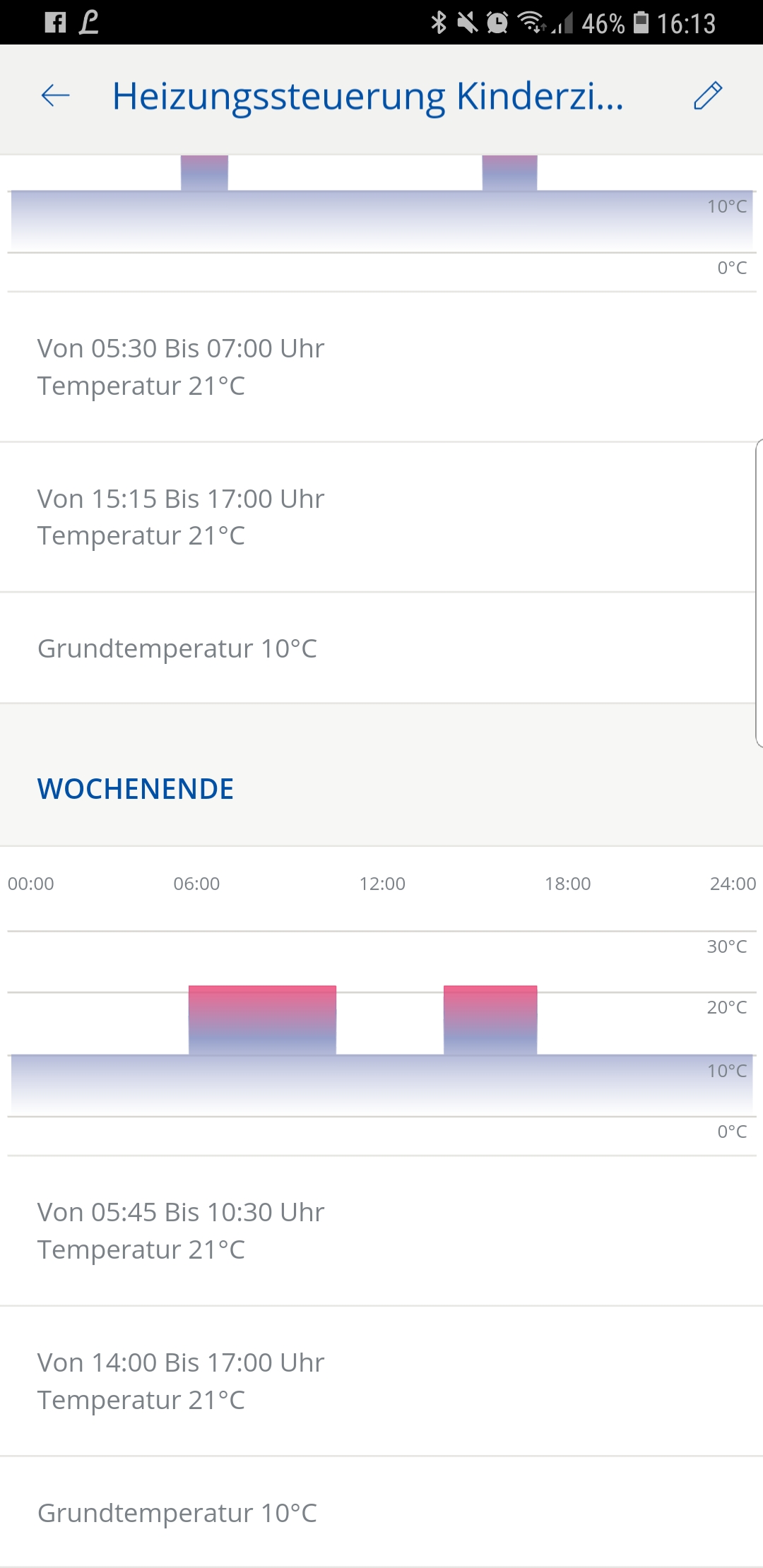 • Die Temperatur wird nur zu den angegeben Zeitpunkten automatisch geändert - also Werktags 5:30 und 15:15 auf 21°C bzw. 07:00 und 17:00 auf die Grundtemperatur von 10°C.
