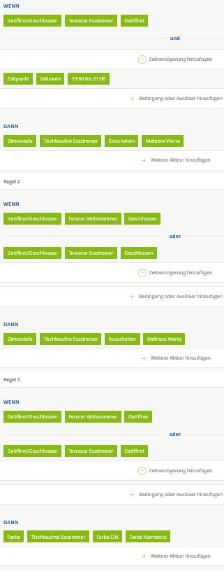 Also 9 Fenster / Türkontakte mit oder verknüpft, dann noch den Zeitbereich 19.00 bis 22.00 festgegelgt, dann die dimmstufe, Farbe, usw. festgelegt.