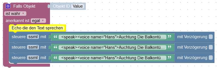 Ich setzte einen Zustand wenn das Fenter/Tür nach einem gewünschten Zeitraum offen ist. Das ist die Objekt ID die überwacht wird, wenn "wahr" wird der Text über die gewünschten Echos gesprochen. Bin noch am testen, daher keine Garantie ob es zuverlässig funktioniert. Probiers einfach mal aus. VG