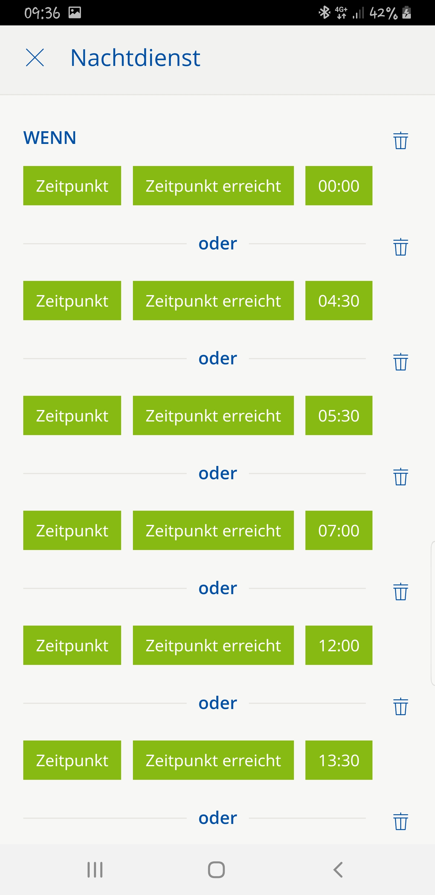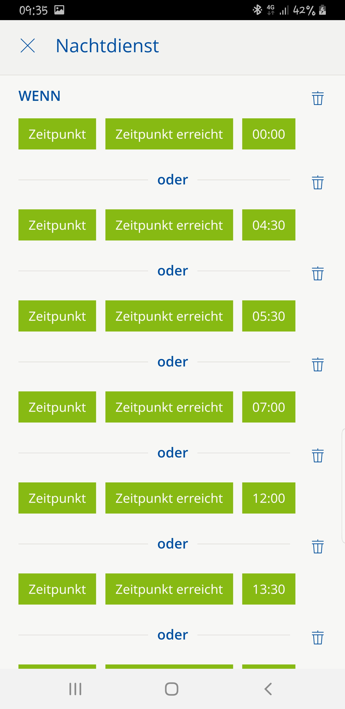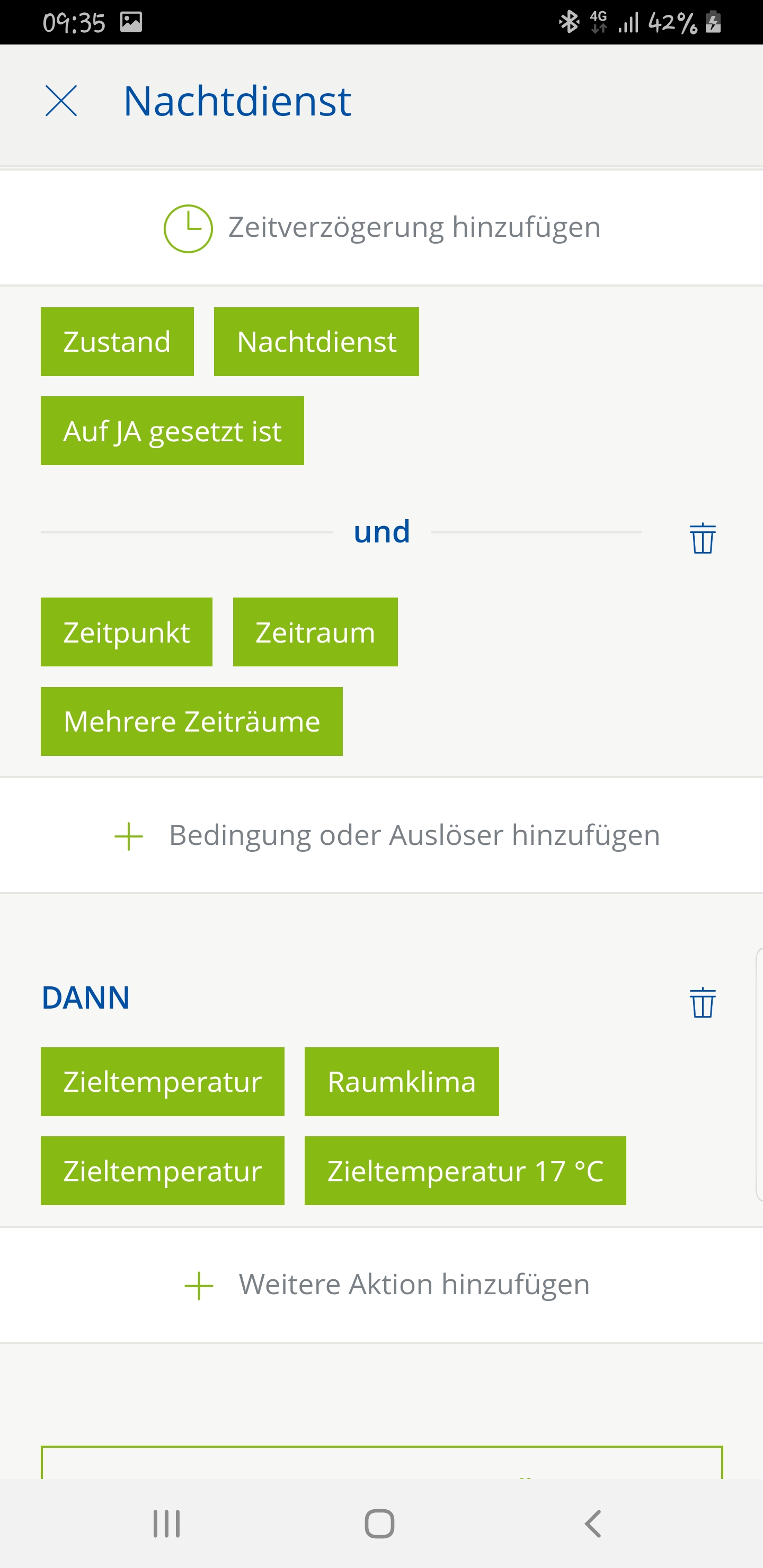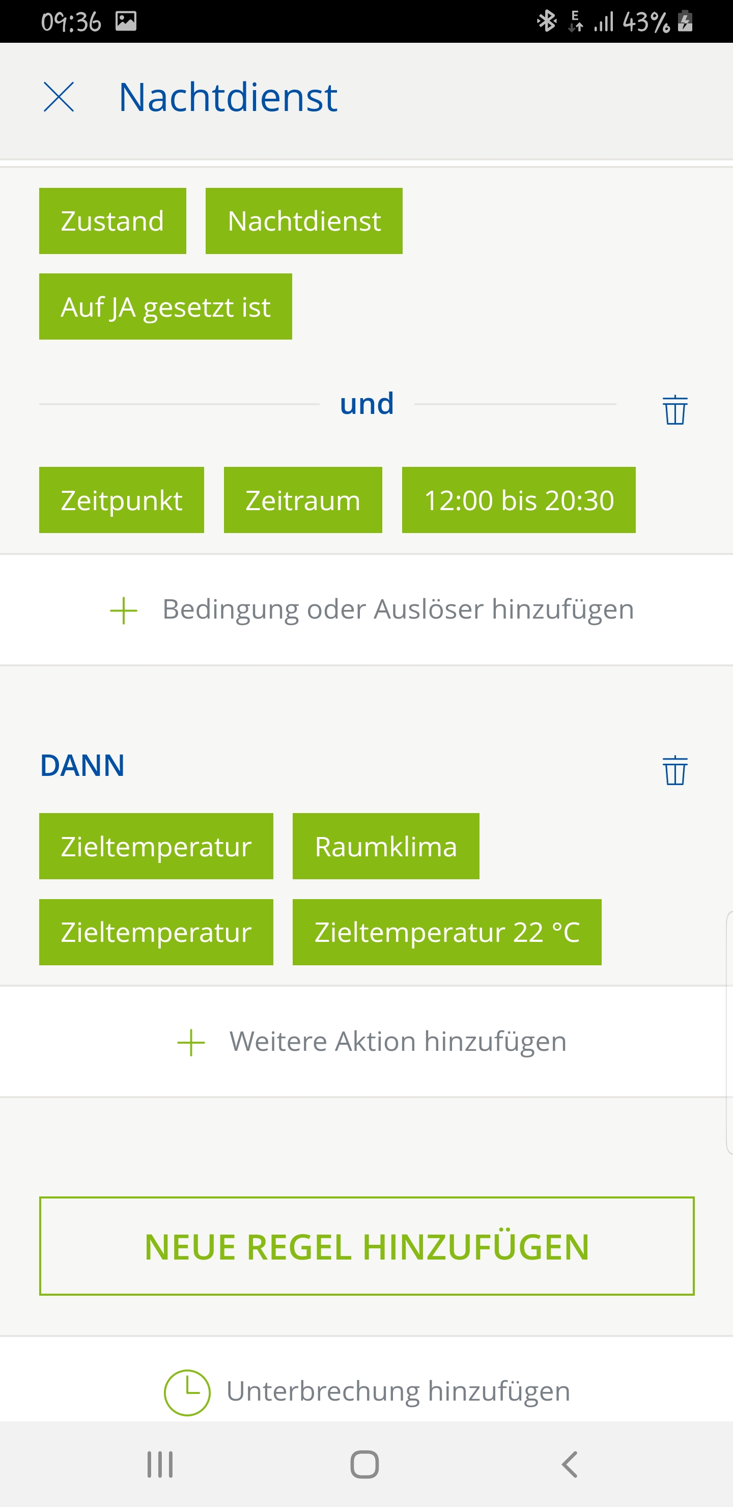 • Ich weiß nicht, ob es rein mit dem Zeitpunkt-Ereignis funktioniert. Gehe in deinem Szenario mal von Raumtemperatur - Temperaturänderung und Zieltemperatur - Temperaturänderung aus und setze dann deinen Zeitpunkt als Bedingung dahinter. Die beiden Temperaturänderungsereignisse dienen dann als Trigger zum Einstieg in die Szenario-Regel.