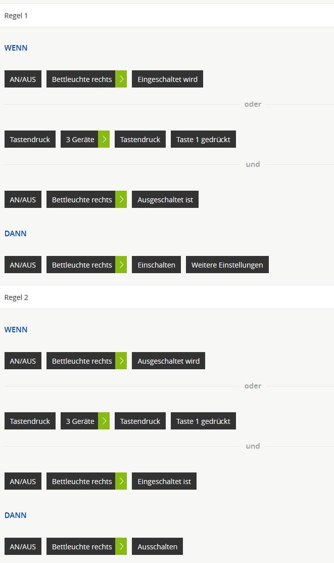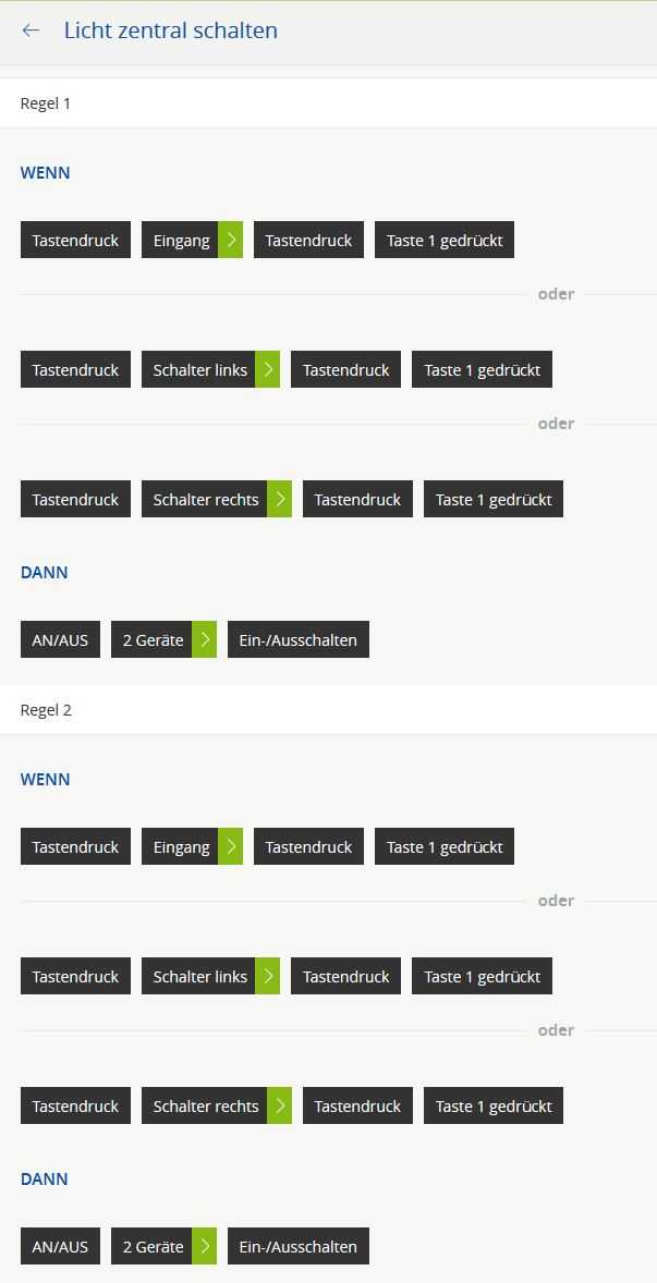 Problem: In meinem Szenario ist der Wurm drin. Ich hatte die konfig versehentlich vernichtet und bekomme es nicht mehr hin. Wenn ich jetzt die Taste 1 betätige und nur eine Lampe leuchtet habe ich den effekt, dass die Lampen hin und her schalten im Wechsel. Leider schaltet die eine eingeschaltete Lampe nicht einfach aus oder die zweite ausgeschaltete Lampe nicht mehr zu.