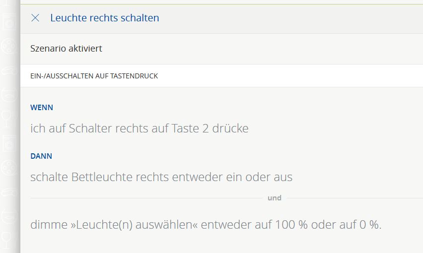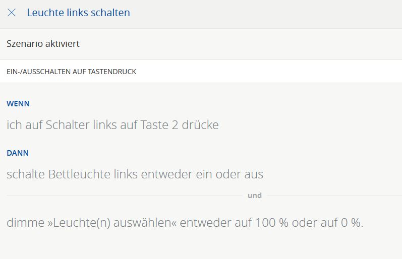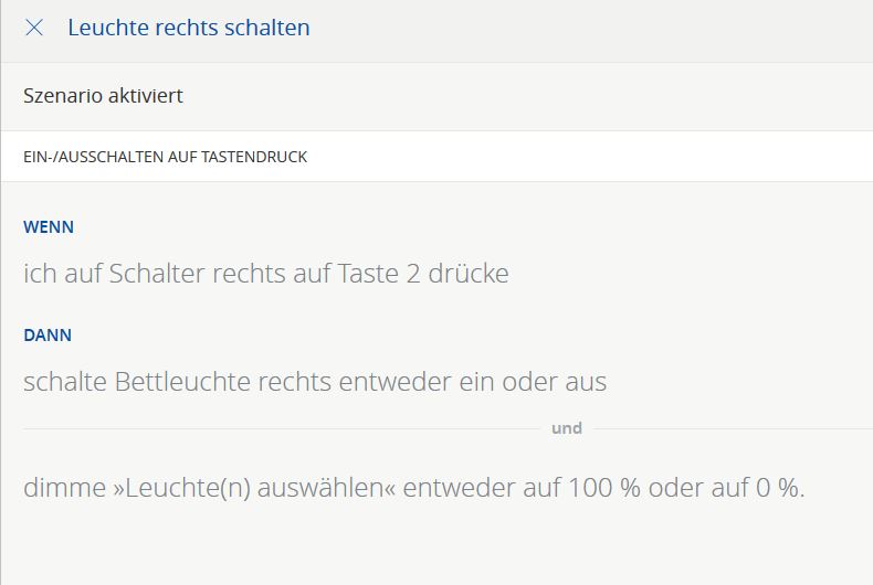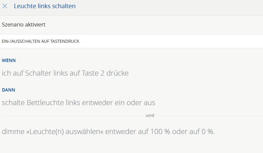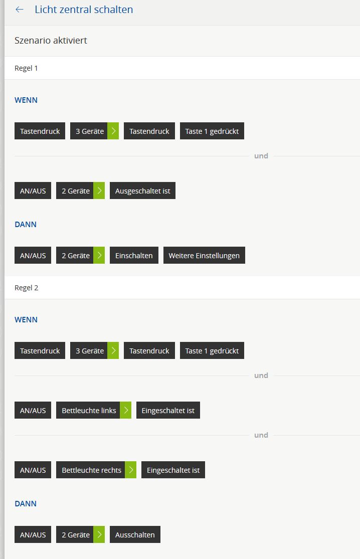 Ich habe zwei Tischlampen an einem Zwischenstecker. In der nähe der jeweiligen Lampe ist ein Wandsender und kann nur für die jeweilige Lampe über Taste 2 single ein- und ausgeschaltet werden. Hierfür habe ich zwei getrennte Szennarien. Die Taste 1 der beiden Wandsender soll jedoch immer für beide Lampen ein- bzw ausgeschaltet werden. Im Eingangsbereich ist noch ein dritter Wandsender und dort sollen beide Lampen ebenfalls über Taste 1 ein- bzw ausgeschaltet werden. HIerfür habe ich ein Szenario erstellt für alle drei Wandsender (Taste 1) und beide Lampen. Die Aufgabe: Wenn eine von beiden Lampen leuchtet soll über Taste 1 bei einem der 3 Wandsender alle Lampen ausgehen oder wieder komplett angehen.
