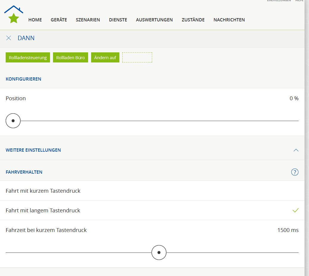Erst einmal Danke denen die bei meinem letzten Problen geholfen haben. Jetzt möchte ich das meine Rolladen wieder mit einem kurzen Tastendruck auf- bzw zu fahren. Habe schon bei Szenario Rolladen auf den Stift oben rechts gedrückt und versucht das Szenario zu ändern, finde aber den, in einem Beitrag beschriebenen, Button "kurzen Tastendruck" nicht. Hat vieleicht jemand eine, für einen Anfänger verständliche, Lösung? Habe übrigens die Zentrale Generation 2.