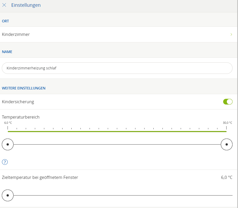 Beide Einstellungen findest du, wenn du auf das Gerät gehst, nicht auf das Raumklima. Wenn du auf der Raumklima-Seite bist, hast du unten das eingebundene HKT. Das anwählen und oben rechts auf das Zahnrad gehen. Da kannst du dann sowohl die Kindersicherung aktivieren, als auch die Temperatur bei geöffnetem Fenster einstellen.