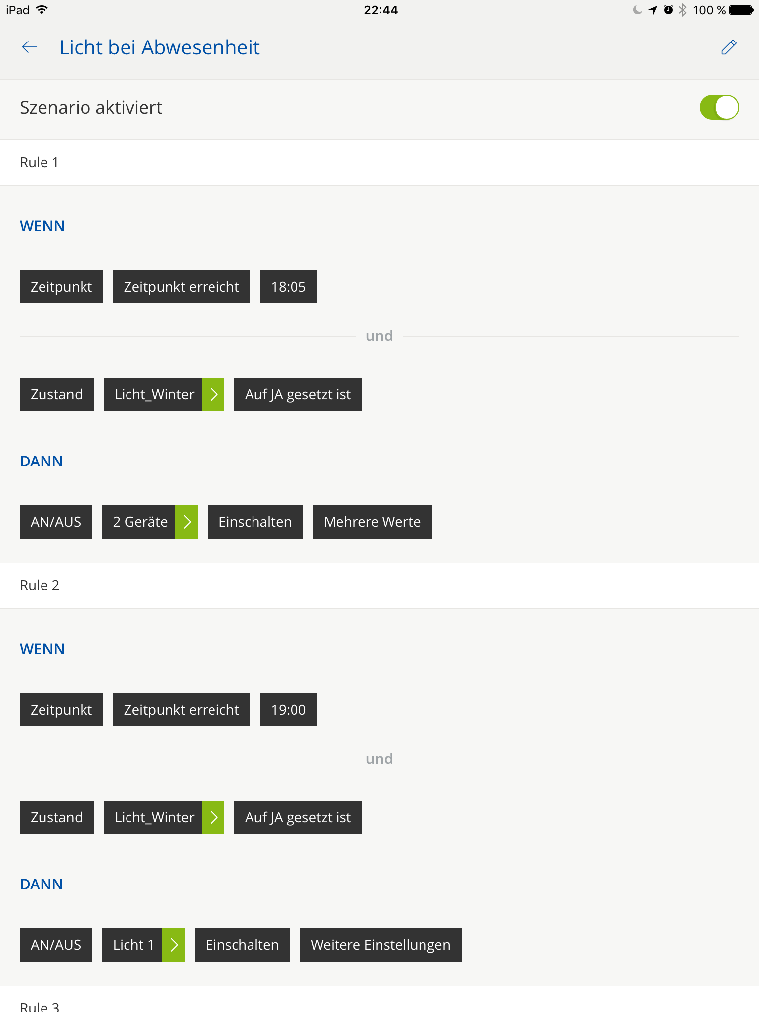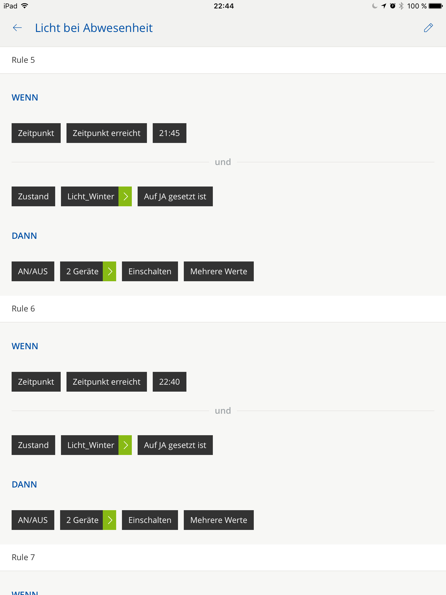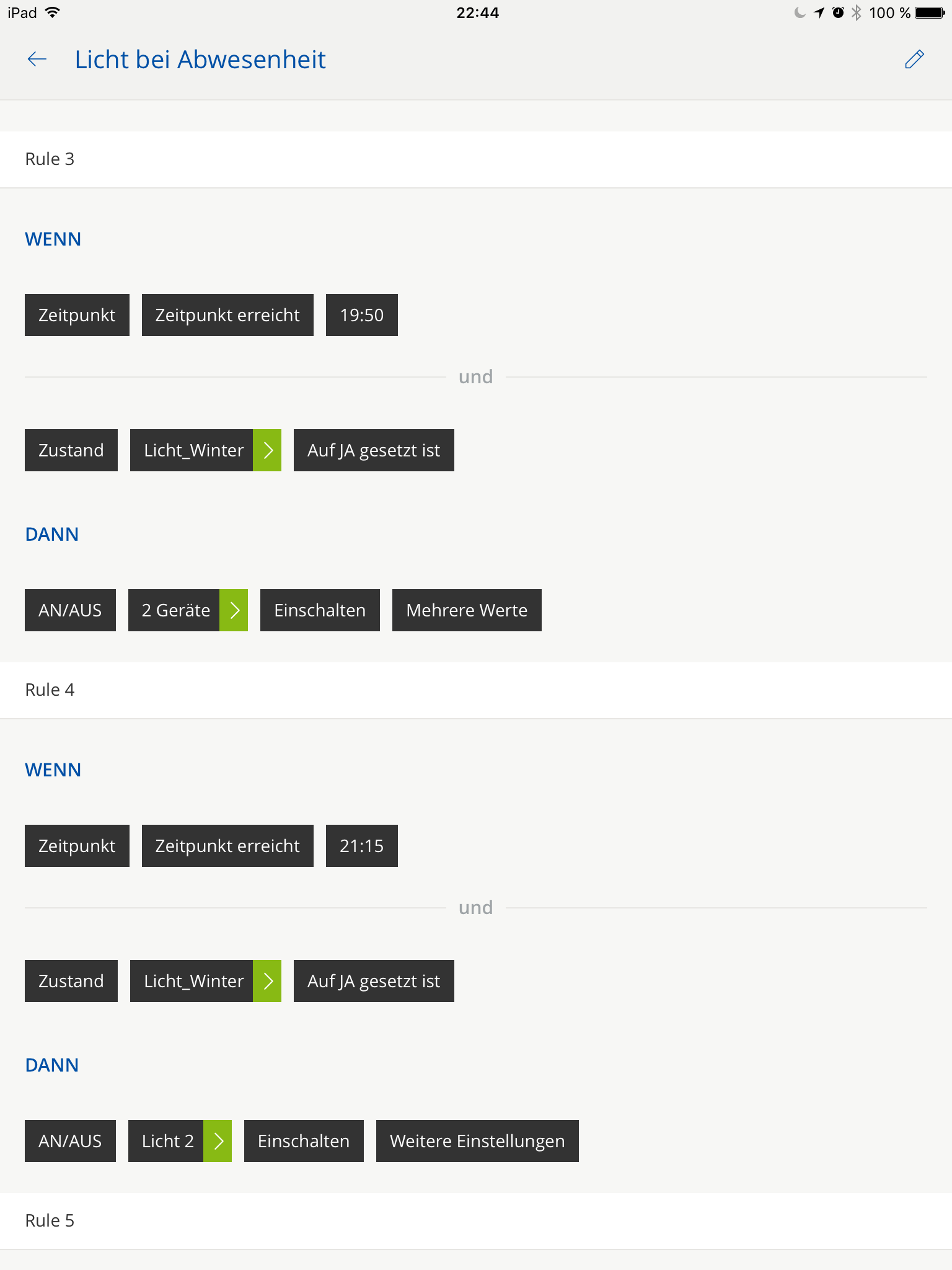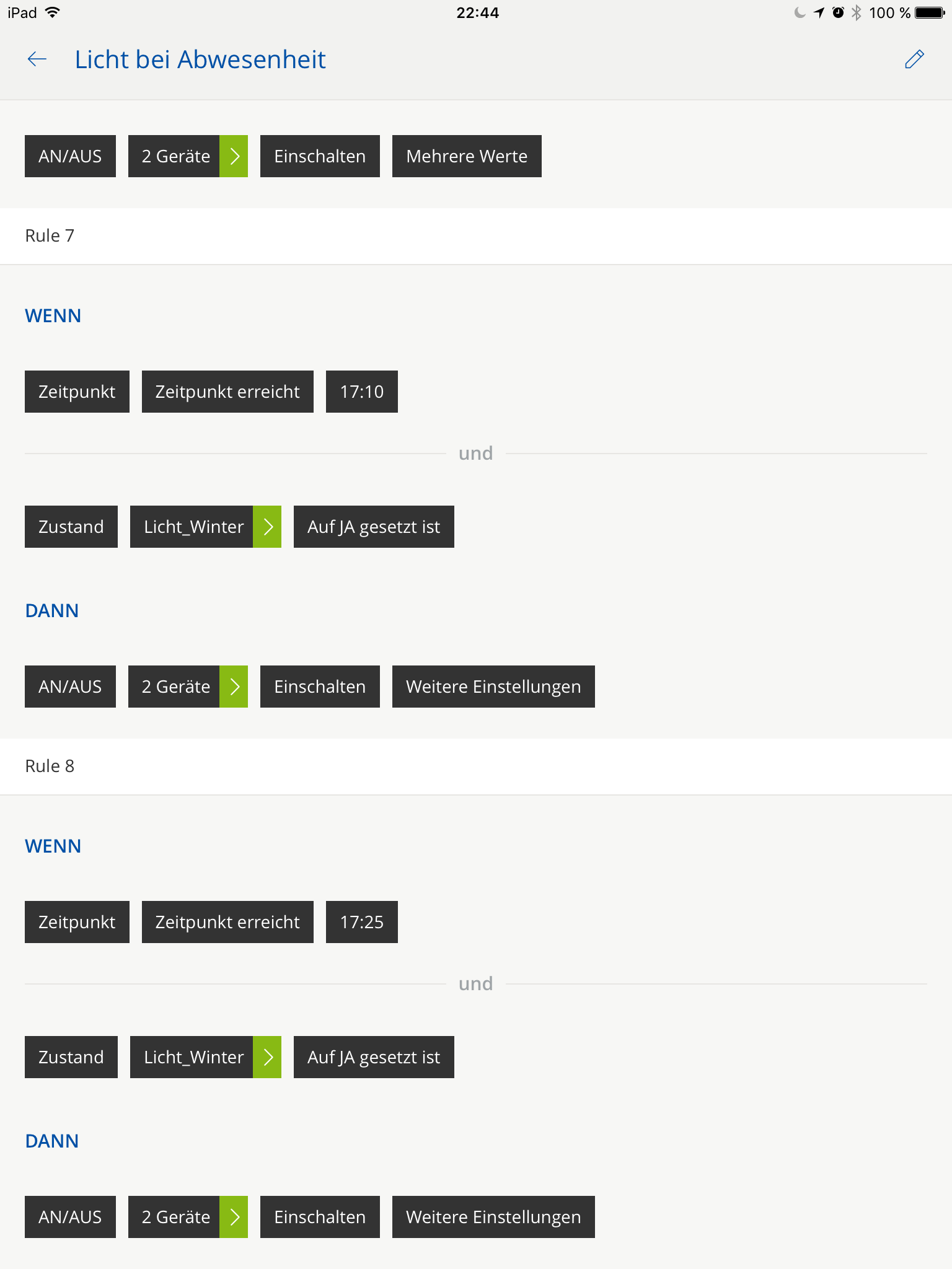 Will mit dem in den Bildern gezeigten Szenario mit 8 Regeln 2 Zwischenstecker schalten. Es werden nicht alle Regeln ausgeführt. 1. Schalten gegen 21:15 Warum