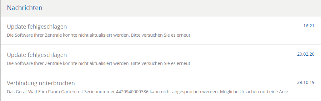 • Ich habe eine Zentrale V1. Irgendwann wurde offensichtlich ein Update eingespielt was aber schief gegangen ist. Also wurde (wird) mir unter Meldungen angezeigt, das dass Update schief gelaufen ist und ich es noch einmal versuchen soll.