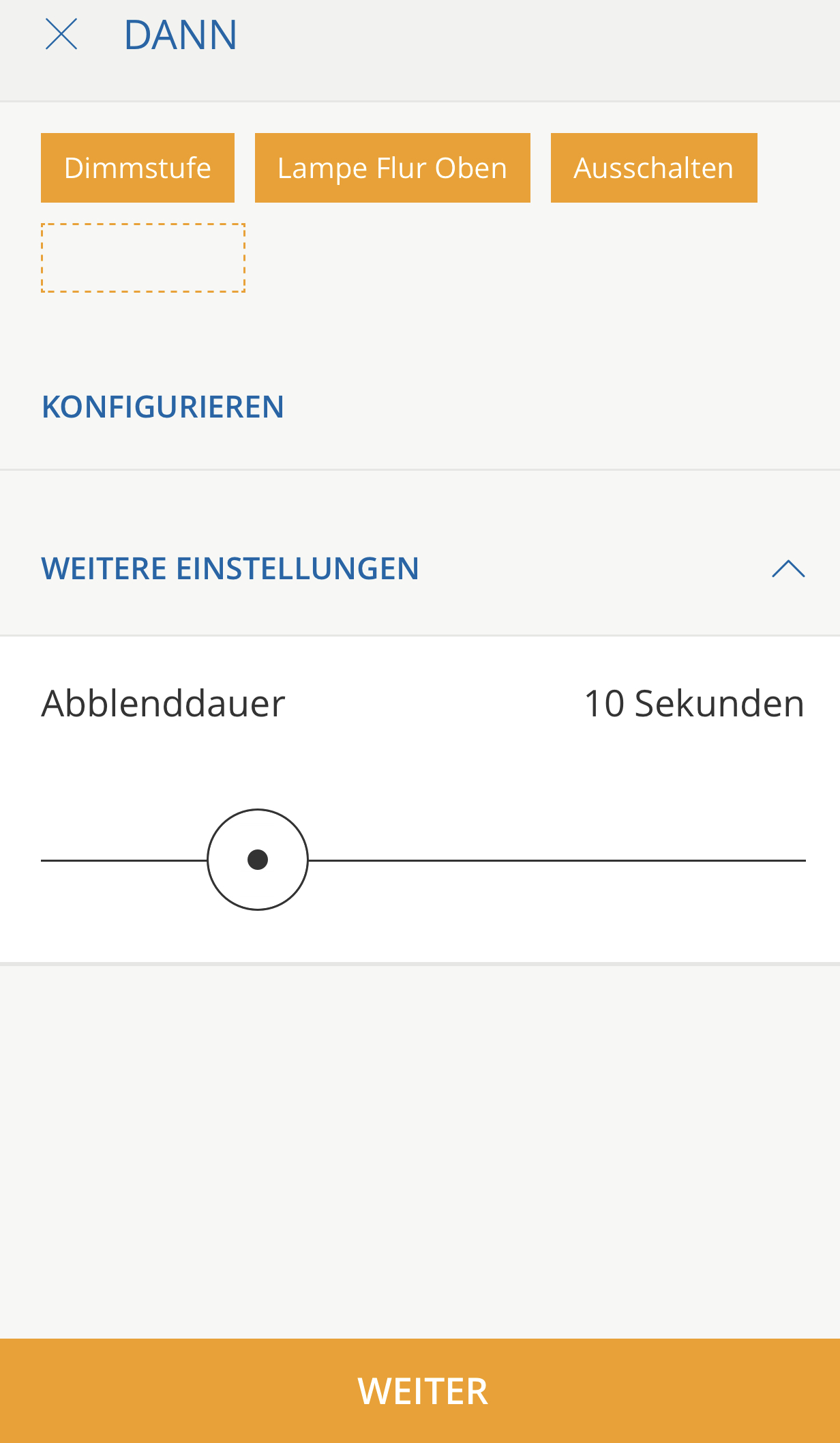 Hallo Olliwer, genauso hab ich es auch gemacht. Nur leider geht dann bei mir nach 10 sec das Licht einfach aus. Hab auch schon andere Werte eingestellt, z.B. 20 sec, dann geht das Licht nach 20 sec aus und ich dachte es wird 10 bzw 20 sec lang ganz langsam dunkel !?!?!?Es gibt die Funktion Dimmstufe Ausschalten und dort „Mehrere Werte“, da kannst D...