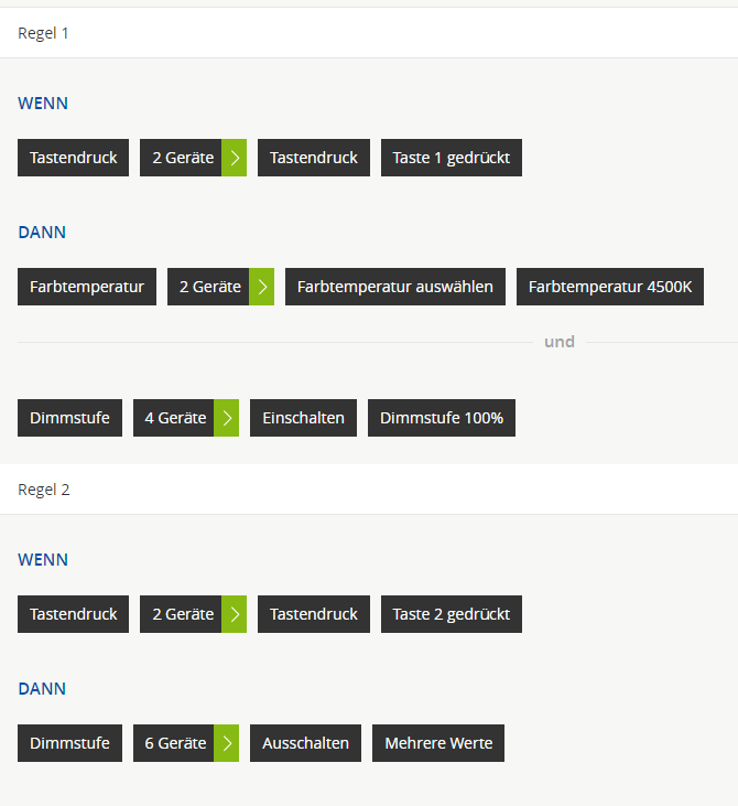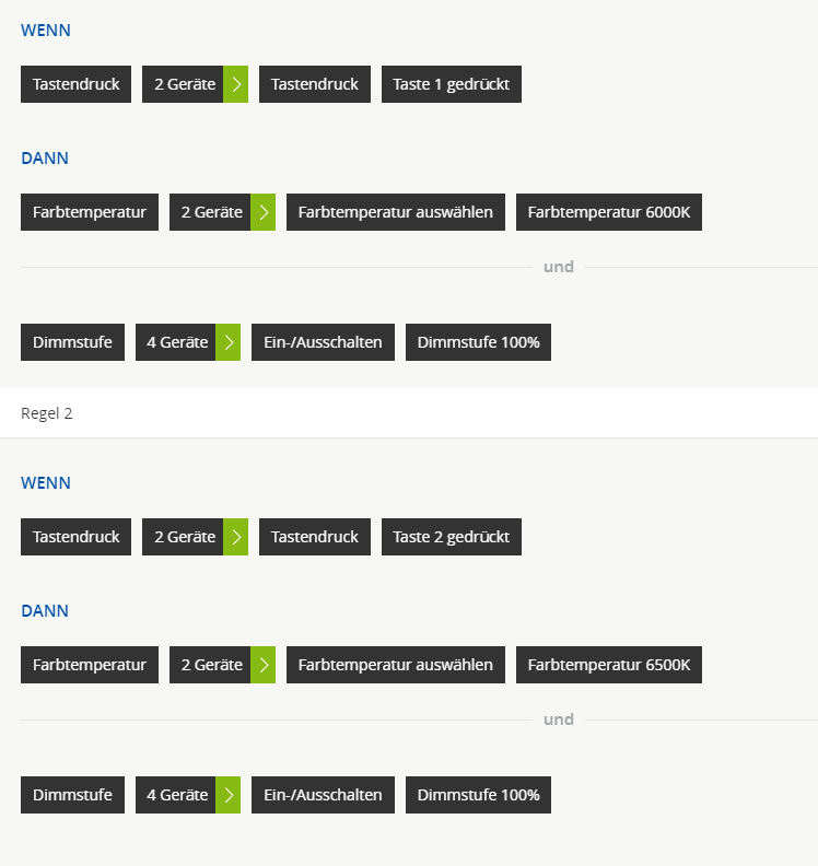 Ist ja so gedacht, das es egal ist welche Taste gedrückt wird. Heist das Toggle? Wenn Taste 2 oder 1 gedrückt wird und das Licht ist an, dann geht,s aus. Wenn Taste 1 oder 2 gedrückt wird und das Licht ist aus, dann geht's an mit der Farbtemperatur. Wie gesagt hat eigentlich funktioniert bis Gestern.Sagen wir mal so. Ich hab's nicht neu erstellt sondern mal deaktiviert und wiede...