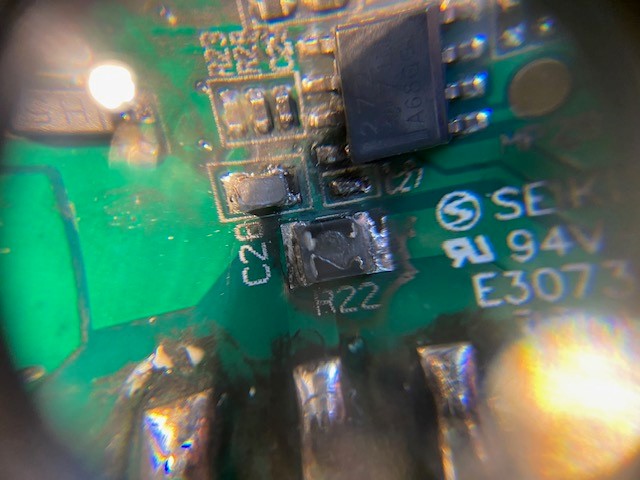 Hier mal noch 2 Bilder. Einmal das Board im allgemeinen und dann mit Lupe auf die verschmorte Stelle (hab alles mit einem Q-Tip sauber gemacht, damit man überhaupt was erkennt):