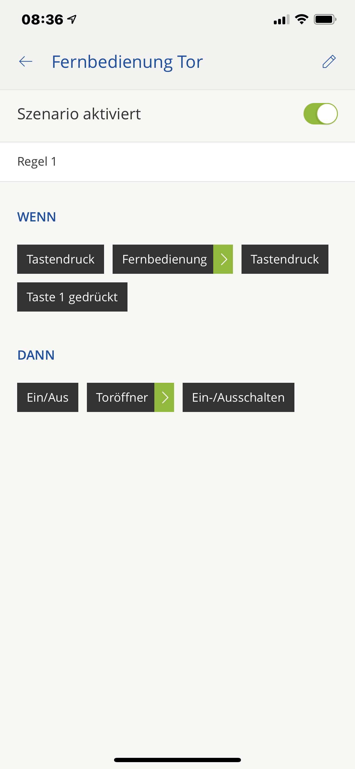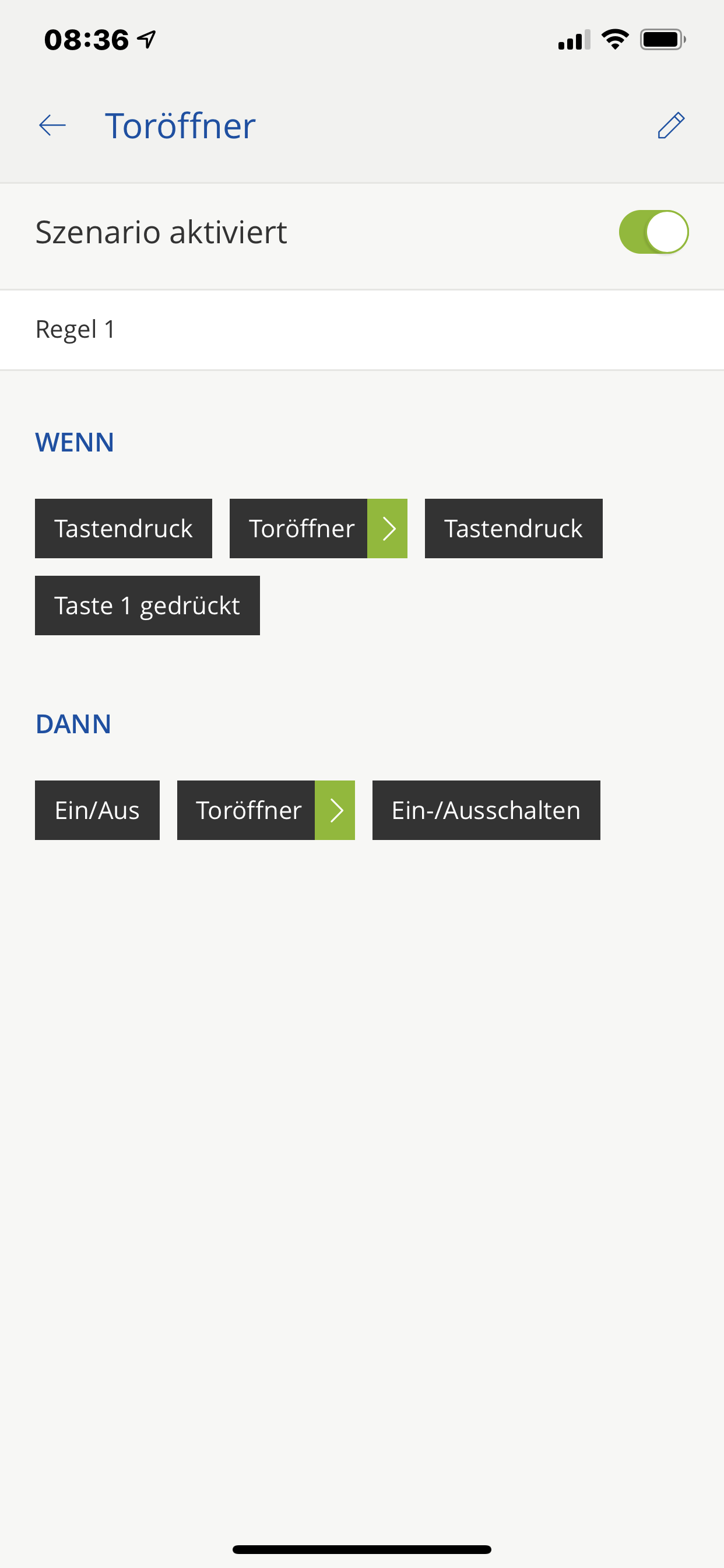 Ich befürchte , das der Innogy Schalter defekt ist. Morgen kommt ein neuer her.Probiere mal nur ein Szenario zu machen und den Schalter ODER Fernbedienung DA...
