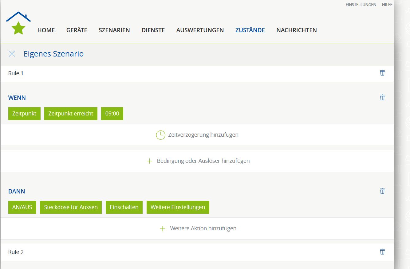 Ich habe Rule 1 mal so gestaltet, dass sich bei einem bestimmten Zeitpunkt um 09:00 Uhr der Zwischenstecker "Steckdose aussen" einschaltet und unter "Weitere Einstellungen" zeitverzögertes Ausschalten nach 2 Stunden. Jetzt müsstest Du noch eine Rule 2 mit anderen Zeiten erstellen. Alle Angaben ohne Gewähr.....;>)) und die Cracks hier kennen sicher noch eine elegantere Lösung.