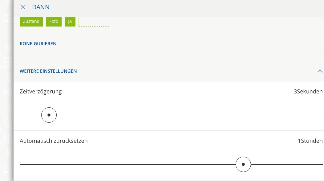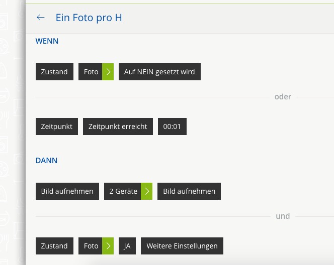 Ich habe ein Szenario erstellt, das ein Foto / Stunde machen soll. Zum ersten Start muss ich den Zustand einmalig auf "Nein" setzen. Danach wird ein Foto gemacht, der Zustand auf "Ja" gesetzt und eine Stunde später wieder zurückgesetzt(dadurch wieder "nein" und das Spiel beginnt von vorne. Um den Trigger zu synchronisieren auf die "gerade Stunde" setze ich den Zustand um 00:01 auf nein - also dem Zeitpunkt an dem das erste Foto gemacht wird.