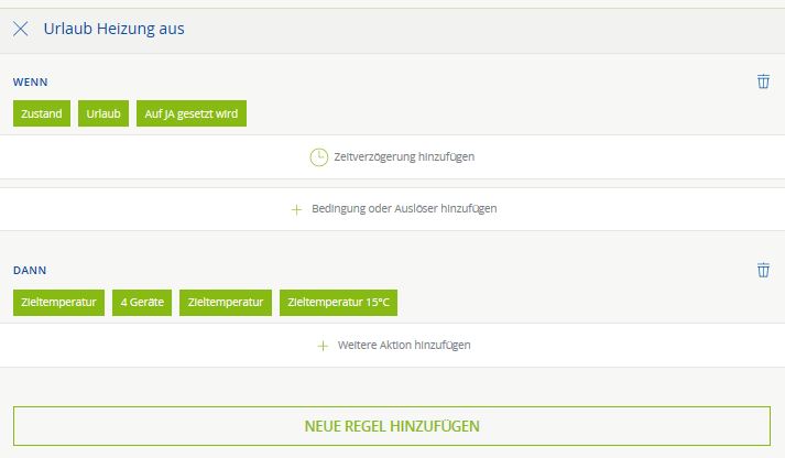 WENN Zustand Urlaub auf JA gesetzt wird ODER Raumtemperatur 4 HKT Temperaturänderung UND Zustand Urlaub auf JA gesetzt ist DANN Zieltemperatur 4 HKT Zieltemperatur 15°C