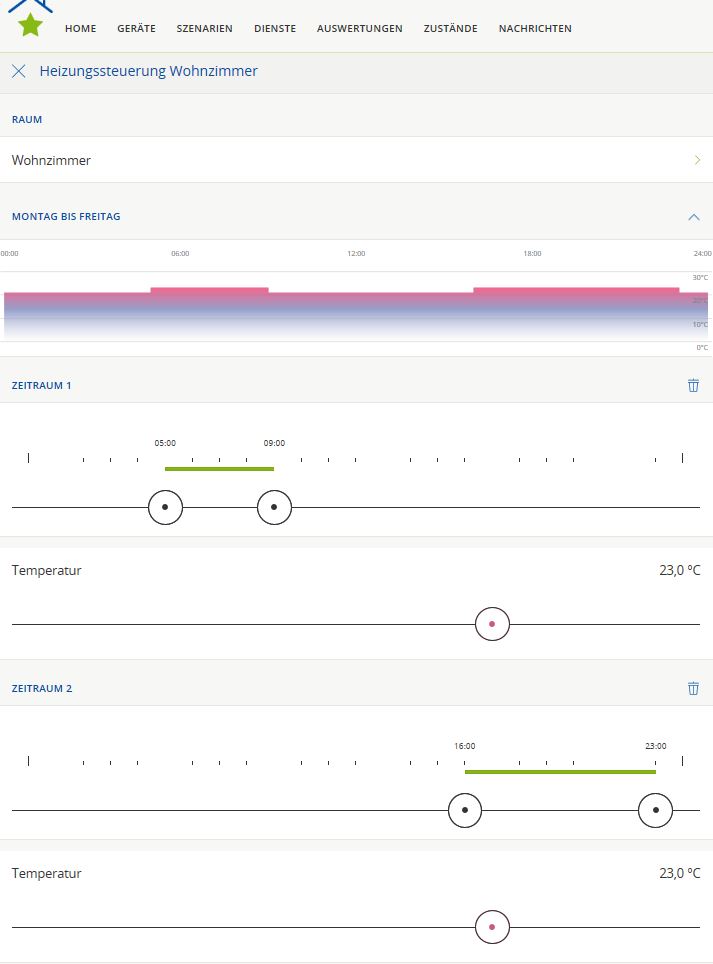 Als Backup Lösung für die nicht funktionierenden Innogy Heizungsprofile: Ich weiss nicht, ob man so ein Profil auch selbst programmieren kann. Vielleicht klappt es ja dann. Aber ich bin da noch nicht erfahren genug. Wäre es also möglich so ein Szenario (Mo-Fr von 5.00-9.00 Uhr auf 24Grad und 17-23.00 Uhr auf 24 Grad, ansonsten 22 Grad selber zu programmieren. Oder geht das nur über die voreingestellten Innogy Szenarien (Klima-Wenn ja wäre es super toll, wenn Du mir einen Screenshot schicken kannst.