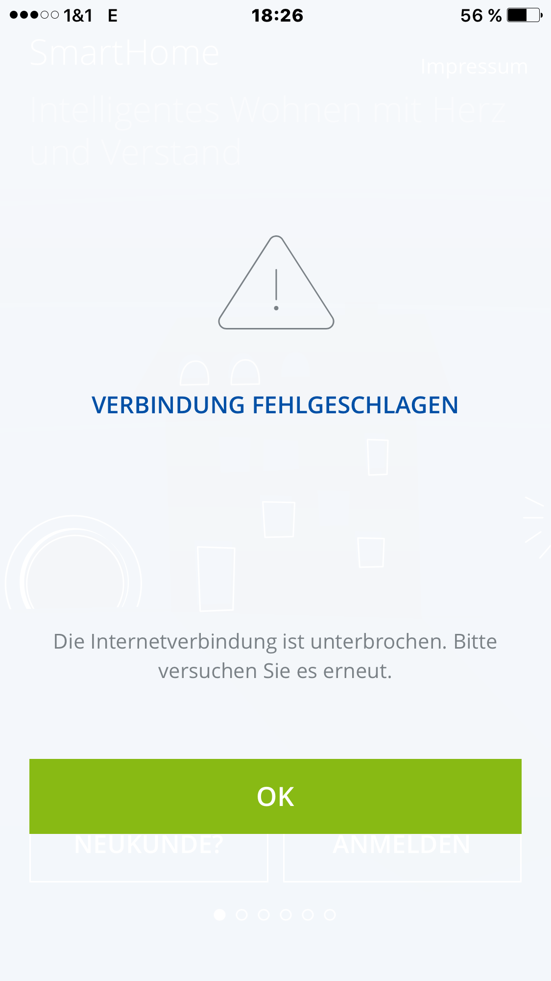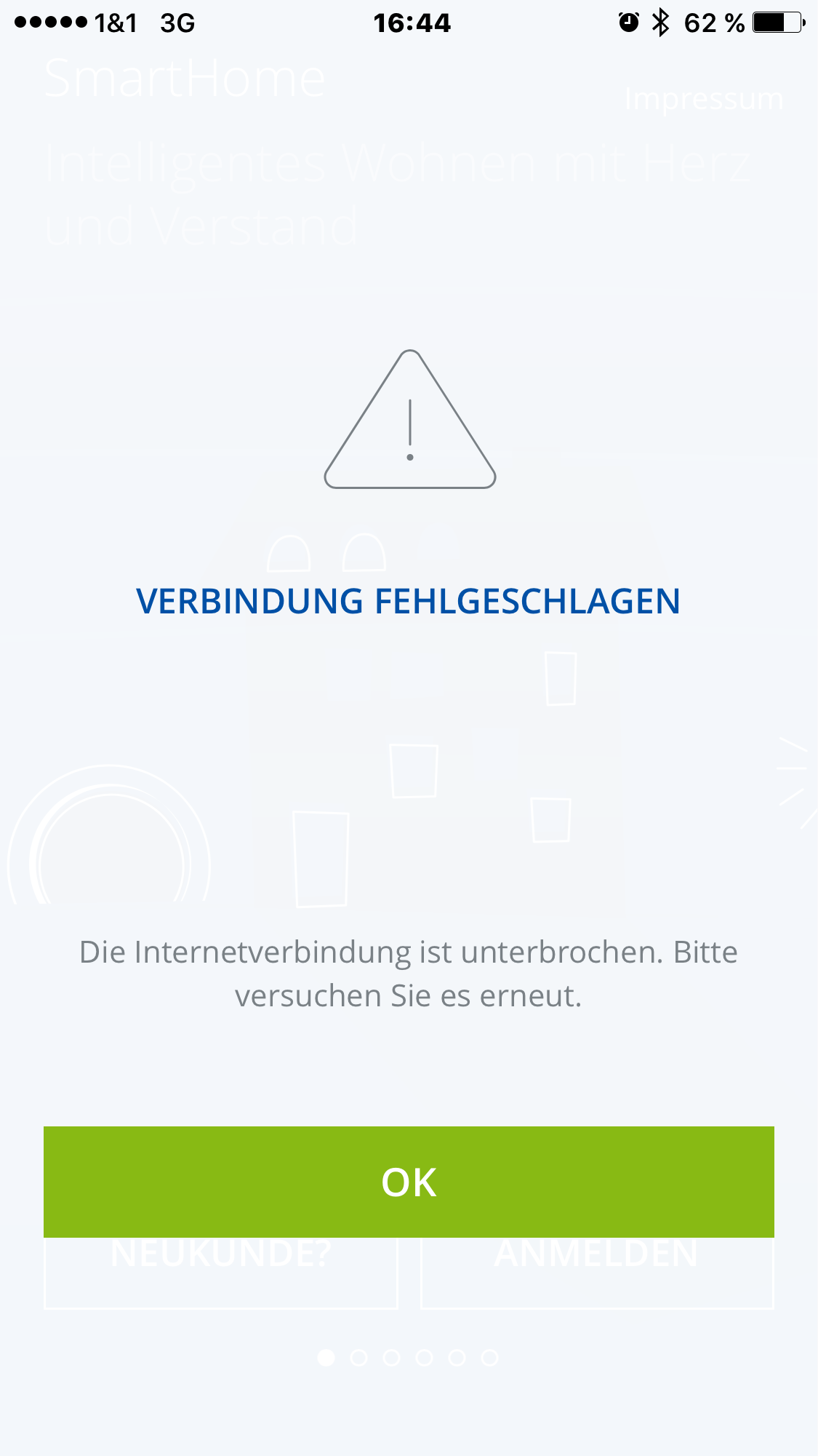 Wie kann man auf eine App zugreifen wenn die Verbindung fehlgeschlagen ist? Dann dürftest Du doch garnicht auf den Homescreen kommen, oder? Und wenn Du dann doch auf die Geräte zugreifen konntest, müsstest Du doch eine auf dem Smartphone sichtbare Seite gehabt haben um auf die Geräte zuzugreifen? Irgendwie beißen sich doch die Aussagen in Deinem Beitrag...?