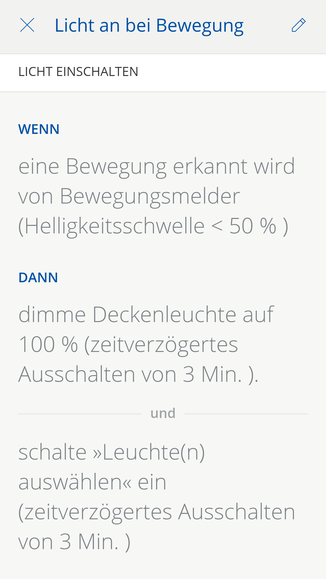 wie oben angedeutet, habe ich ein Problem mit folgendem, eigentlich unkompliziertem Szenario. Der innogy SH Bewegungsmelder erkennt eine Bewegung und soll die Philips hue (über eine Bridge der 1. Generation) erleuchten lassen. Dieses Szenario hat bereits in meinem SH funktioniert. Und zwar so lange, bis ich vor ein paar Tagen eine weitere hue-Lampe ins System integriert habe. Seitdem funktioniert das beschriebene Szenario eben nur noch mit einer Verzögerung von 20 oder 30 Sekunden. Und ja, ich habe bereits die dritte Lampe, den Störer, probeweise wieder aus meinem SH entfernt. Es hat keine Verbesserung bewirkt.