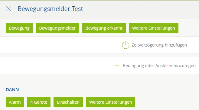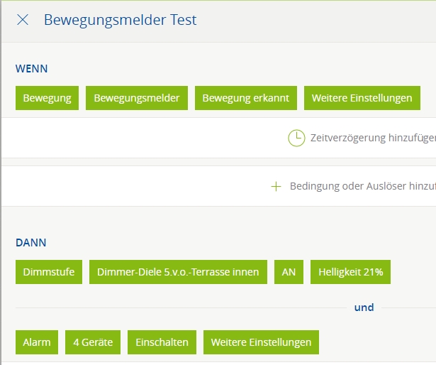 Dieses Szenario (Regel 2) ist für einschalten, das klappt einwandfrei. (siehe oben) Dann möchte ich dieses einbinden, also Bewegungsmelder an (siehe unten)