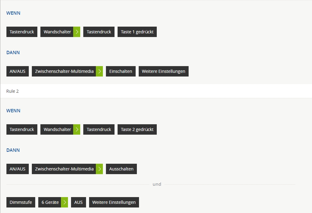 Und in Regel 1 sollte es wieder ausgeschaltet werden. Der Wandtaster ist in einem Nachbarraum in dem ich nicht in den Bereich des Bewegungsmelders komme.