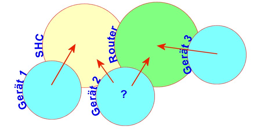 Testen kann man das wohl nur, wenn man den Router vom Stromnetz trennt. Wenn das Endgerät im Netz des Routers zu Hause ist, wird es danach die Verbindung zum SHC verlieren. Dies würde mindestens Gerät 3 aber auch evtl. Gerät 2 betreffen. Wäre Gerät 2 über den Router eingebunden, würde es auch zwangswiese die Verbindung verlieren - auch wenn es den SHC grundsätzlich sehen kann