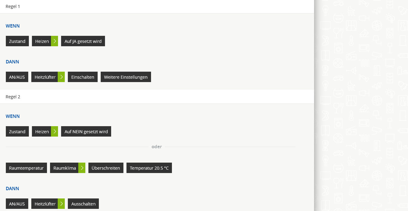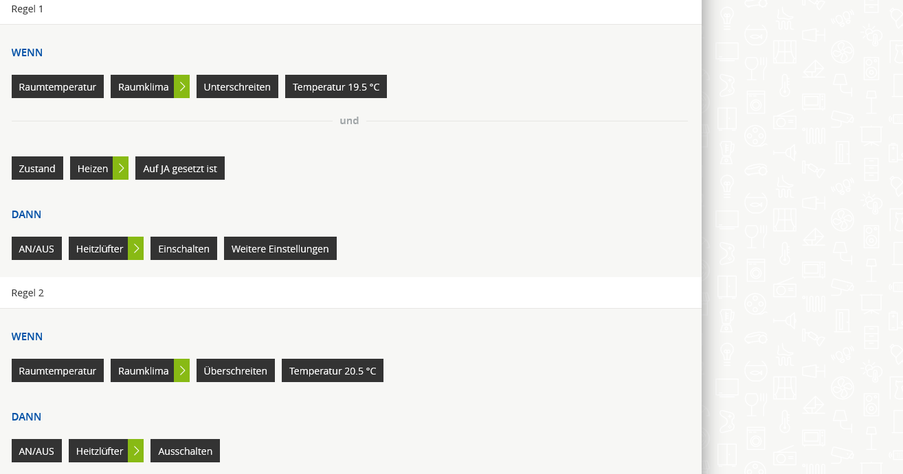 ich möchte über einen Zwischenstecker einen Heizlüfter im Bedarfsfall so steuern, dass er zwischen zwei Temperaturen an-/ausschaltet. Über den Zustand Heizen wird der Zwischenstecker aktiviert, der Heizer läuft bis zur Zieltemperatur und schaltet dann aus (siehe sceenshot). Was mir nicht klar ist, wie ich das Szenario "stricke", um beim Unterschreiten einer Temperatur den Heizer erneut "starten zu lassen. Geht das überhaupt?