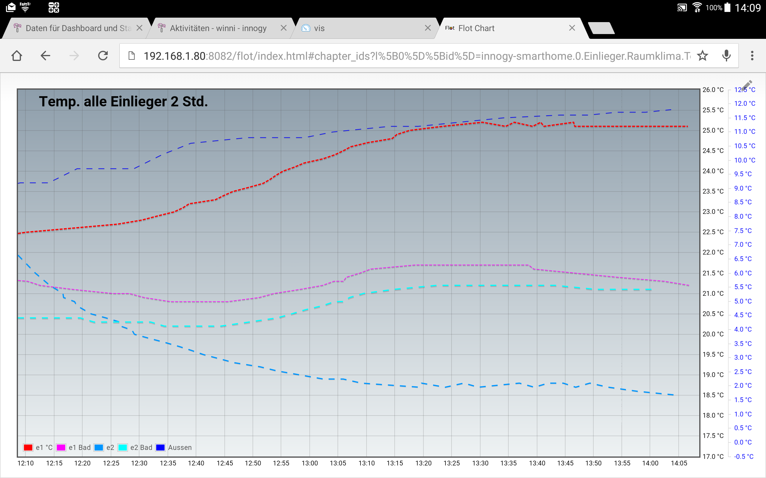 Noch ein Beispiel, 4 Räume, Temperatur-Verlauf die letzten 2 Stunden, sowie die Aussentemperatur von der Netatmo Wetterstation.