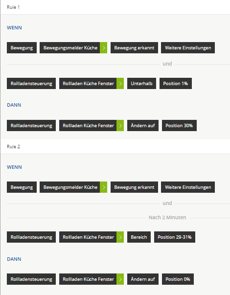 Bei dem Szenario kann es unter Umständen dazu kommen, dass Rollladen zu früh runtergefahren wird. Das kann passieren, wenn Rollos auf 30% stehen und eine Bewegung registriert wird, dann fahren sie nach Ablauf des Timers Runter und kurz drauf wieder auf 30% hoch müssen (wieder eine Bewegung registriert). So wird die vorletzte Bewegung das Runterfahren auslösen. Wenn das unbedingt vermieden werden soll, muss Du das über einen Zustand steuern.