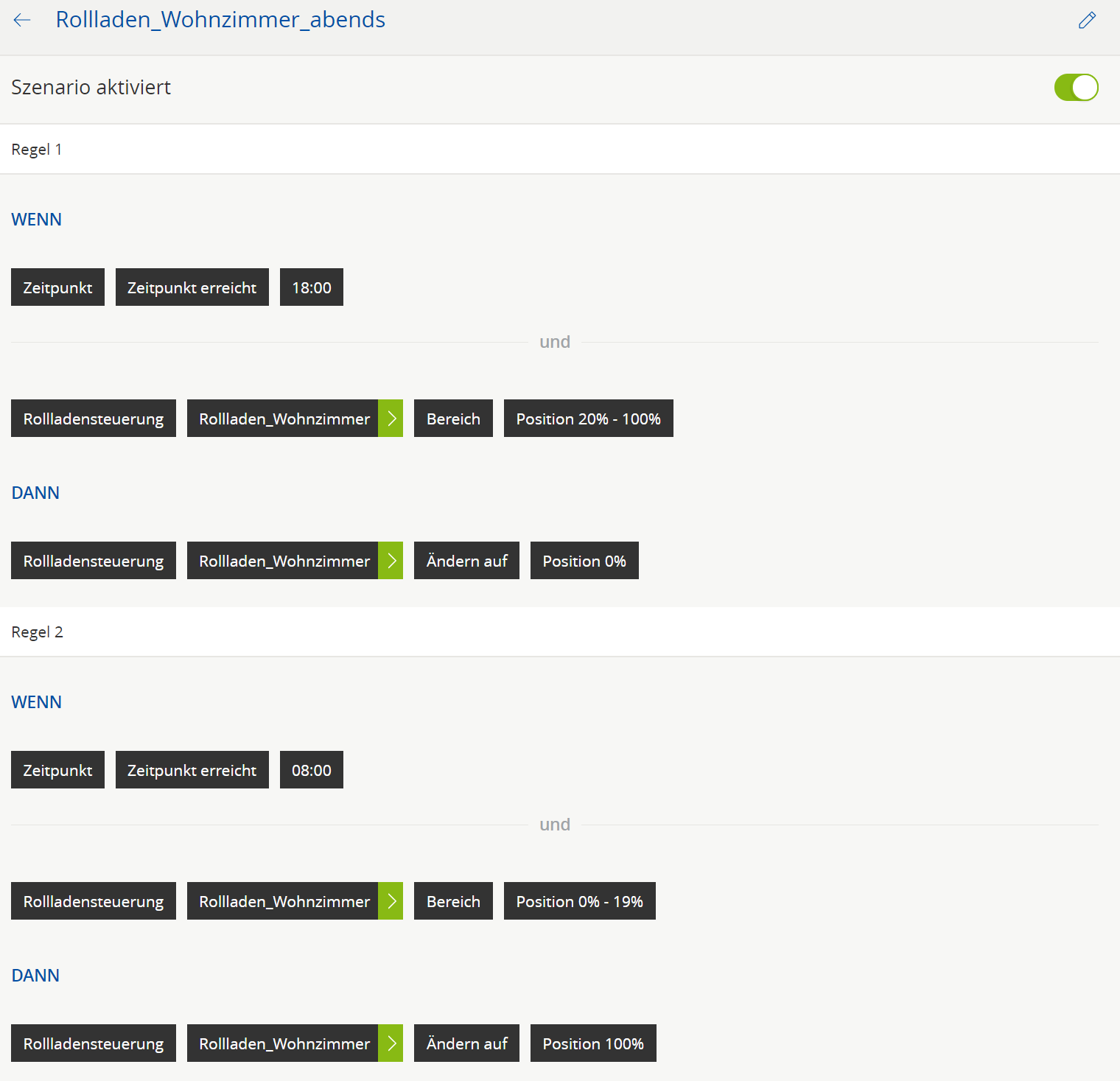 Die Rolladen sollen um 18 Uhr herunterfahren, wenn die Position der Rollläden zwischen 20% und 100% liegt, hochfahren um 08:00 wenn die Position der Rollläden zwischen 0 und 19% liegt.