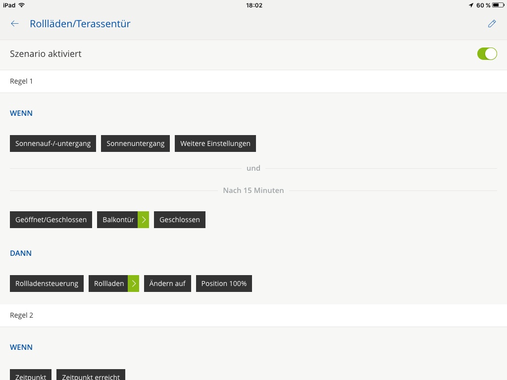Ich möchte das die Rollladen nach Sonnenuntergang und geschlossener Terrassentür herunterfährt und morgens um 7:30 wieder auf Beim anlegen einer neuen Szenerie bekomme ich die und-Funktion nicht rein.