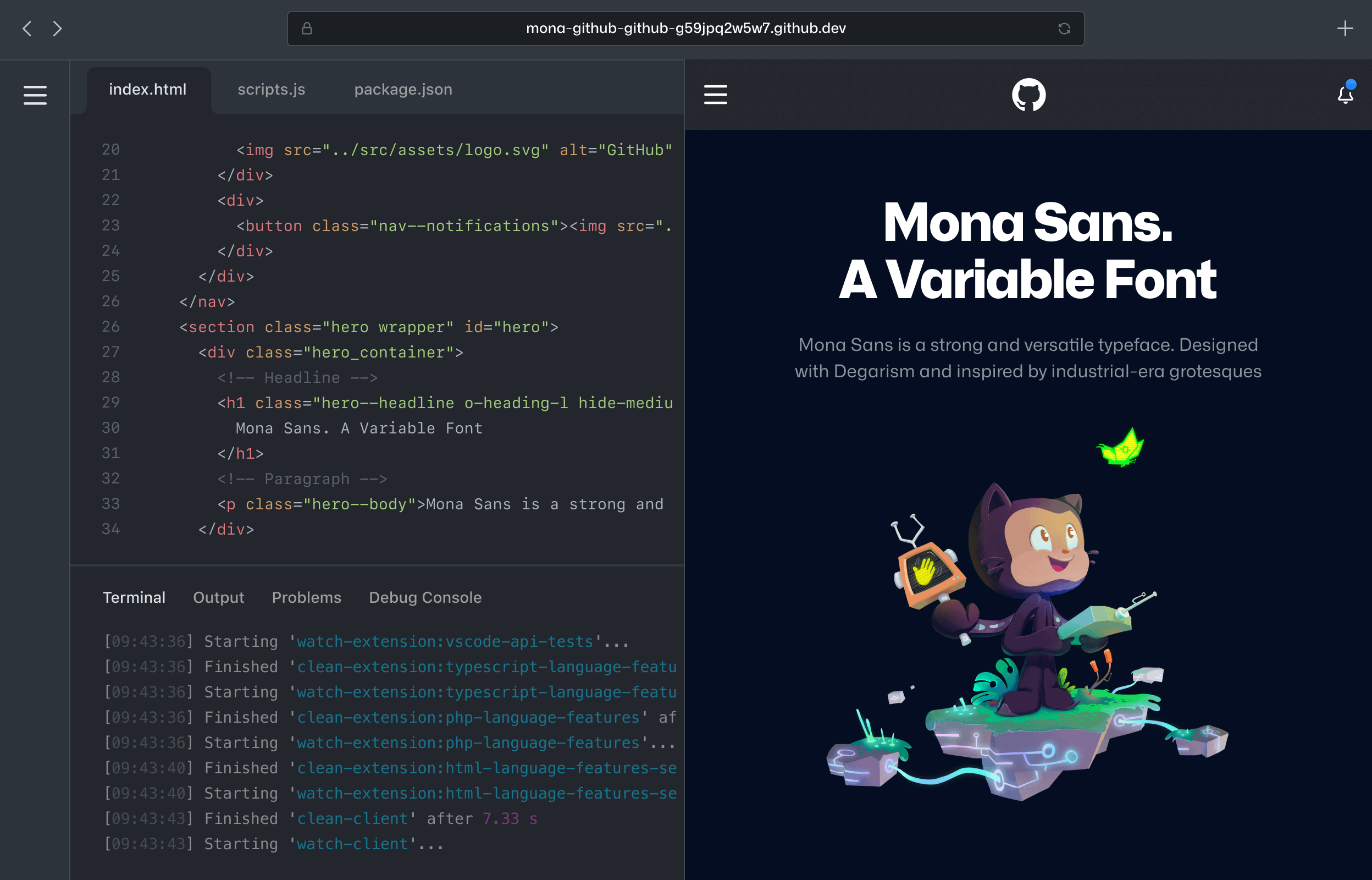 No more building your dev environment while you onboard. Codespaces starts instantly from any repository on GitHub with pre-configured, secure environments. It’s as easy as clicking a button.