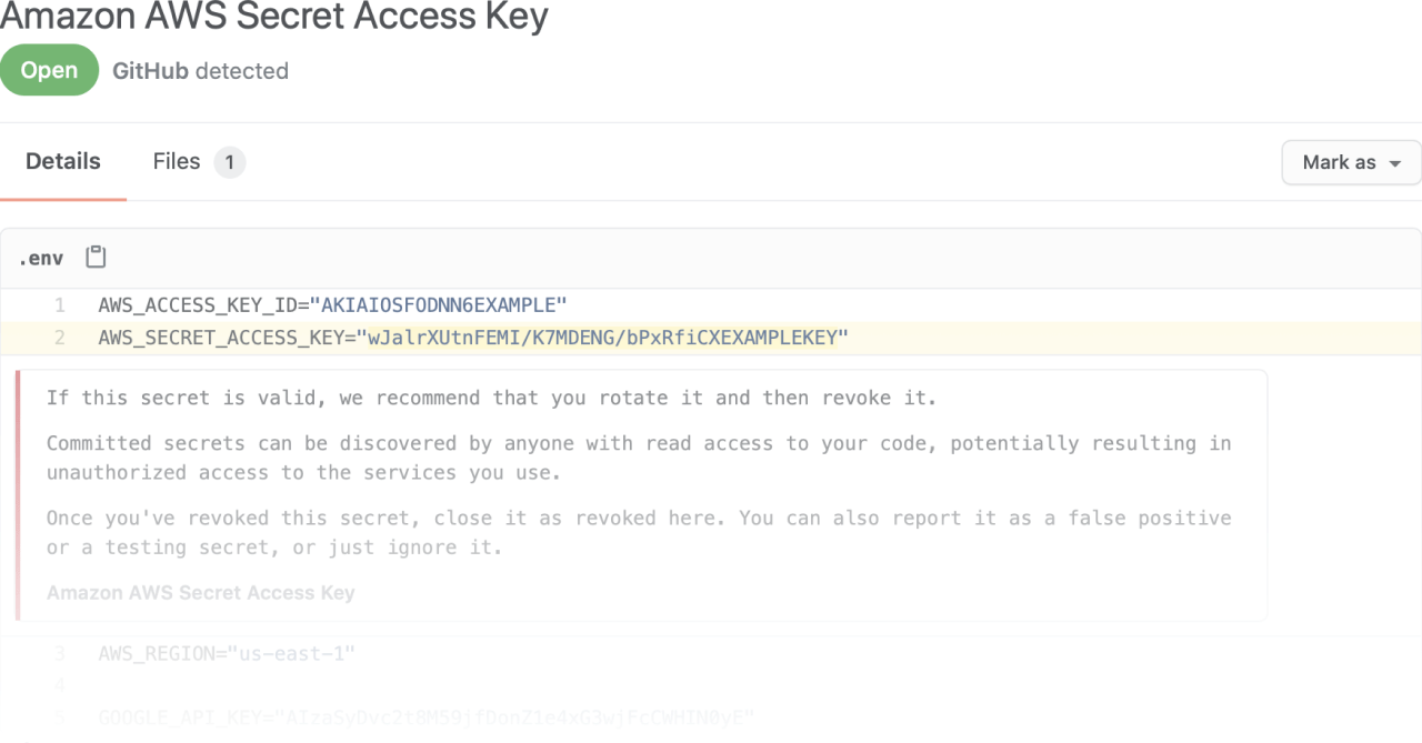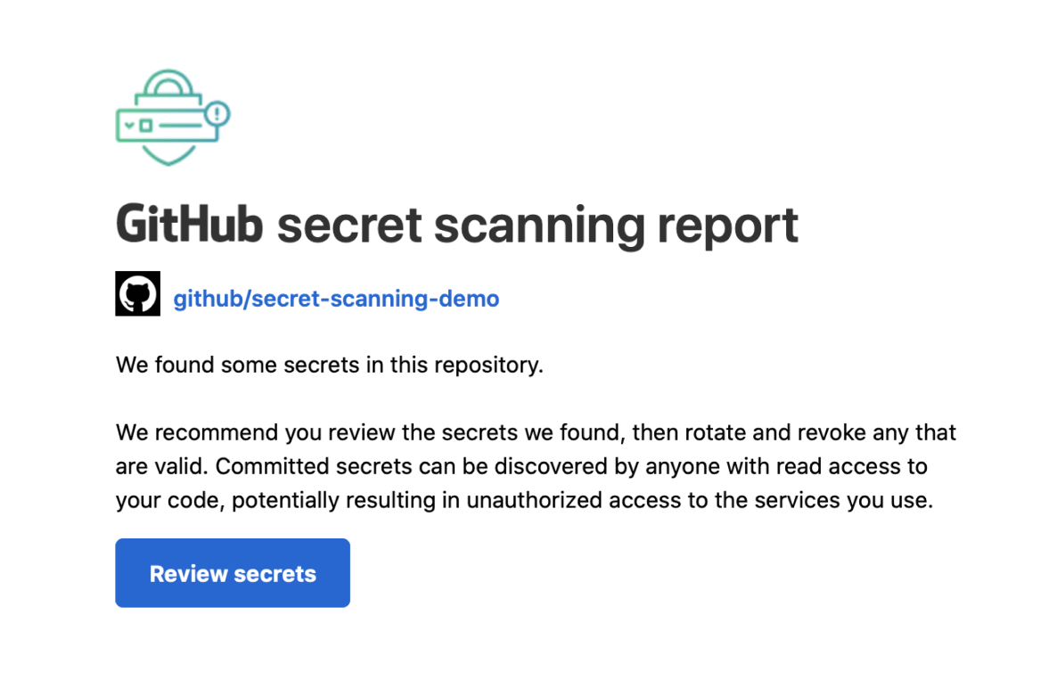 Secret scanning watches your repositories for known secret formats and notifies you as soon as secrets are found.